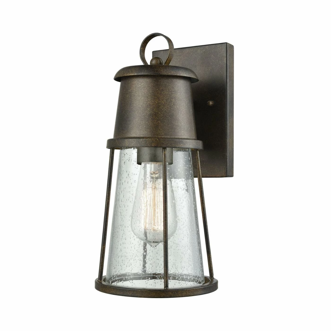 Industrial-chic lighting comes home with the ELK Lighting Crowley 45065/1 1 Light Outdoor Wall Sconce. This simple wall sconce features a slender, practical shape in an appealing hazelnut bronze finish. The clear seeded glass directs the light downward to darkened spaces. Pair with a filament bulb (not included) to complete the look.