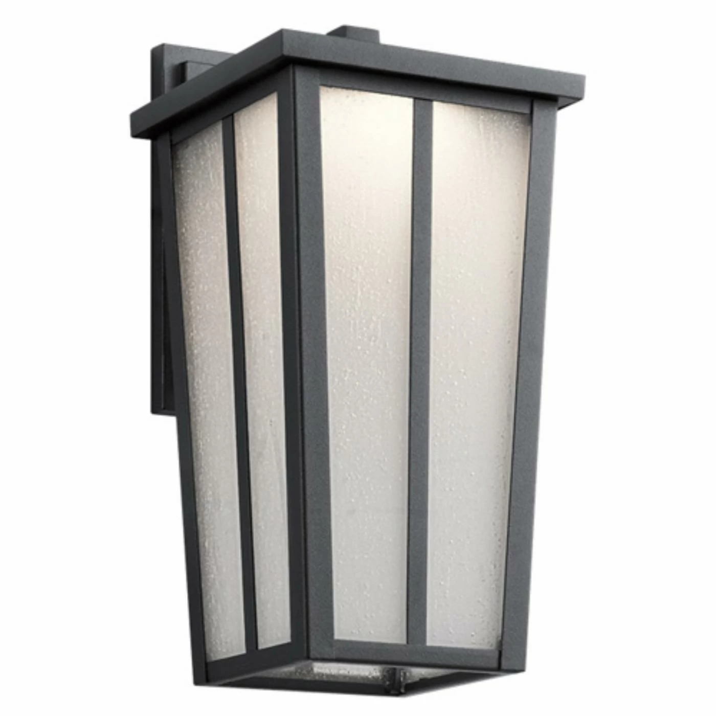 With its California craftsman silhouette and modern sensibilities, this Kichler Amber Valley 4962 Outdoor Wall Sconce is a smart way to light the entrance of your home. This outdoor wall sconce is crafted of aluminum, features a textured black finish, and boasts frosted glass panes. It requires one LED bulb, not included.