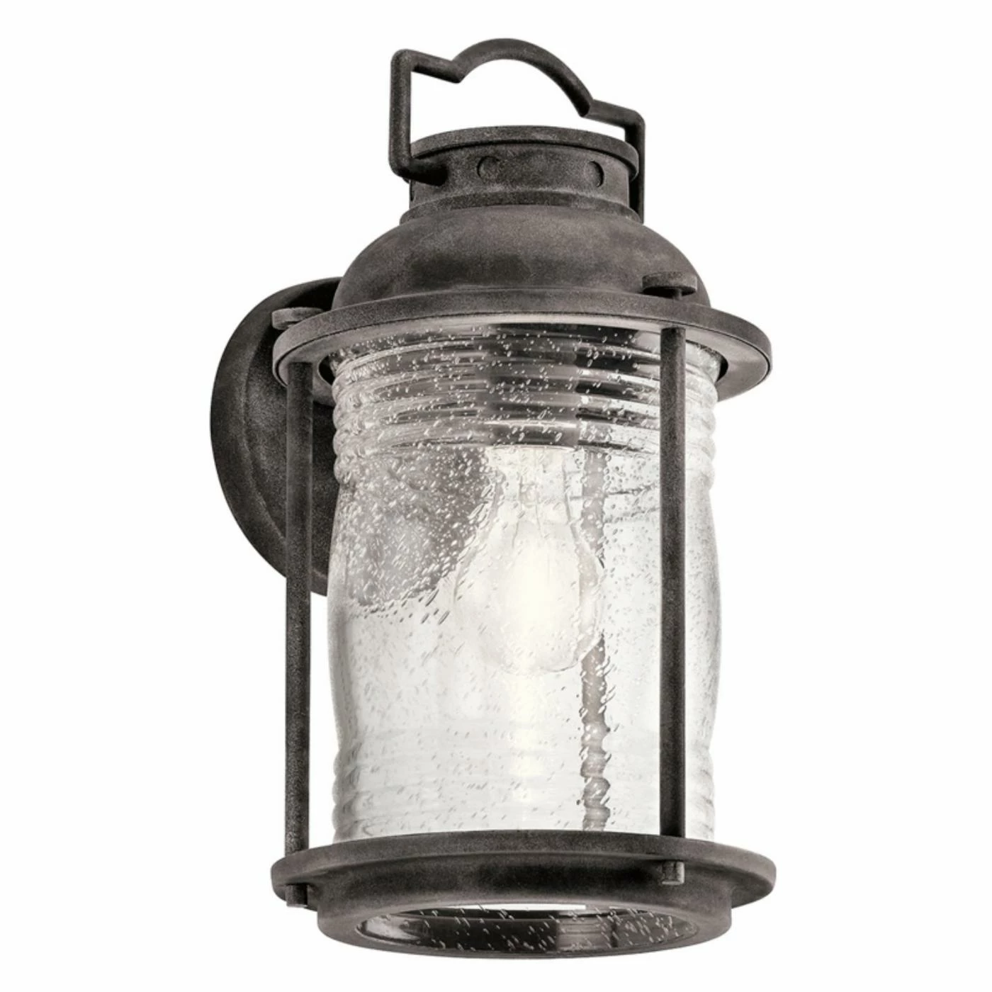 An old timey lantern design and weathered zinc finish make this Kichler Ashland Bay 49570WZC Outdoor Wall Light a whimsical way to welcome guests to your home. It features a ribbed and seeded glass shade that showcases your decorative 100-watt bulb nicely (bulb not included).