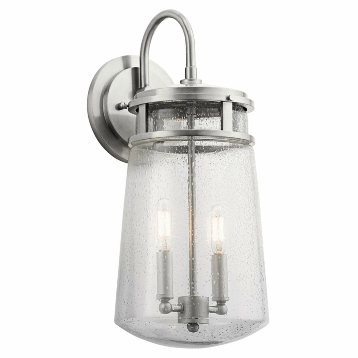 Mount this Kichler Lyndon 49496 Outdoor Wall Sconce on your porch or patio for a touch of traditional elegance. It’s constructed of durable aluminum and clear glass, and is also finished in choice of color. Requires one 60-watt bulb, not included.