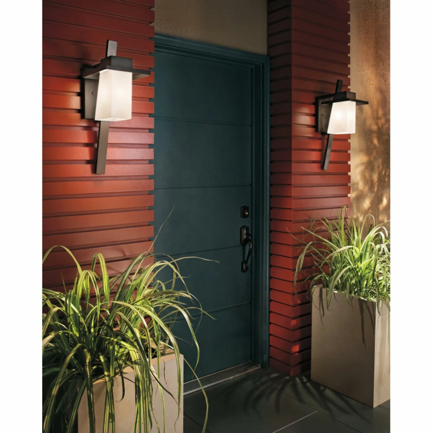 The linear Kichler Stonebrook 4925 Outdoor Wall Sconce has bold mission style, an architectural bronze finish, and angled, rectangular etched glass shade. This distinctive outdoor wall sconce is available in size options and has the coveted ENERGY STAR rating. It requires one bulb, not included.