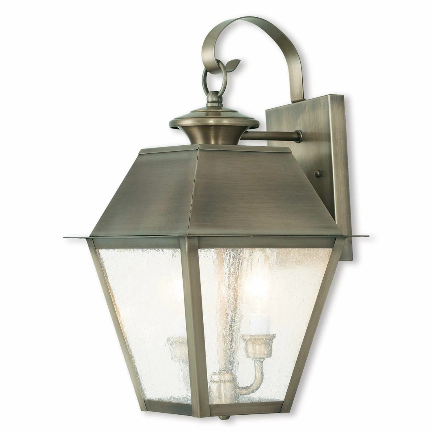 Keep your home safely lit and welcoming to guests with the Livex Lighting Mansfield 2165-29 Outdoor Wall Lantern. The simple lines of the brass framework give it a contemporary feel, while the textured glass adds antique-inspired charm and gently softens the light from three 60-watt bulbs, for a candle-lit effect. The vintage pewter finish completes the look with soft allure.