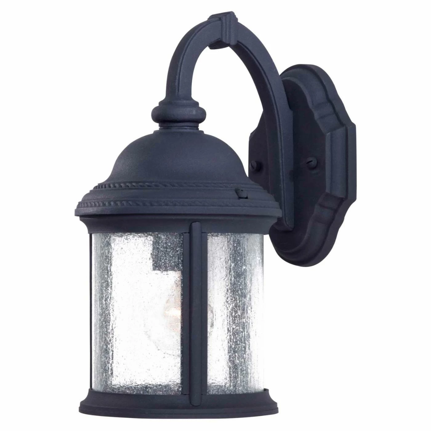 The Minka Lavery Hancock 9010-66 Wall Mount Light features a curved, clear seeded glass shade and a sturdy die-cast aluminum frame. The rich, black finish adds a classic look to your outdoor dΓ©cor which will blend right in with your current furnishings.