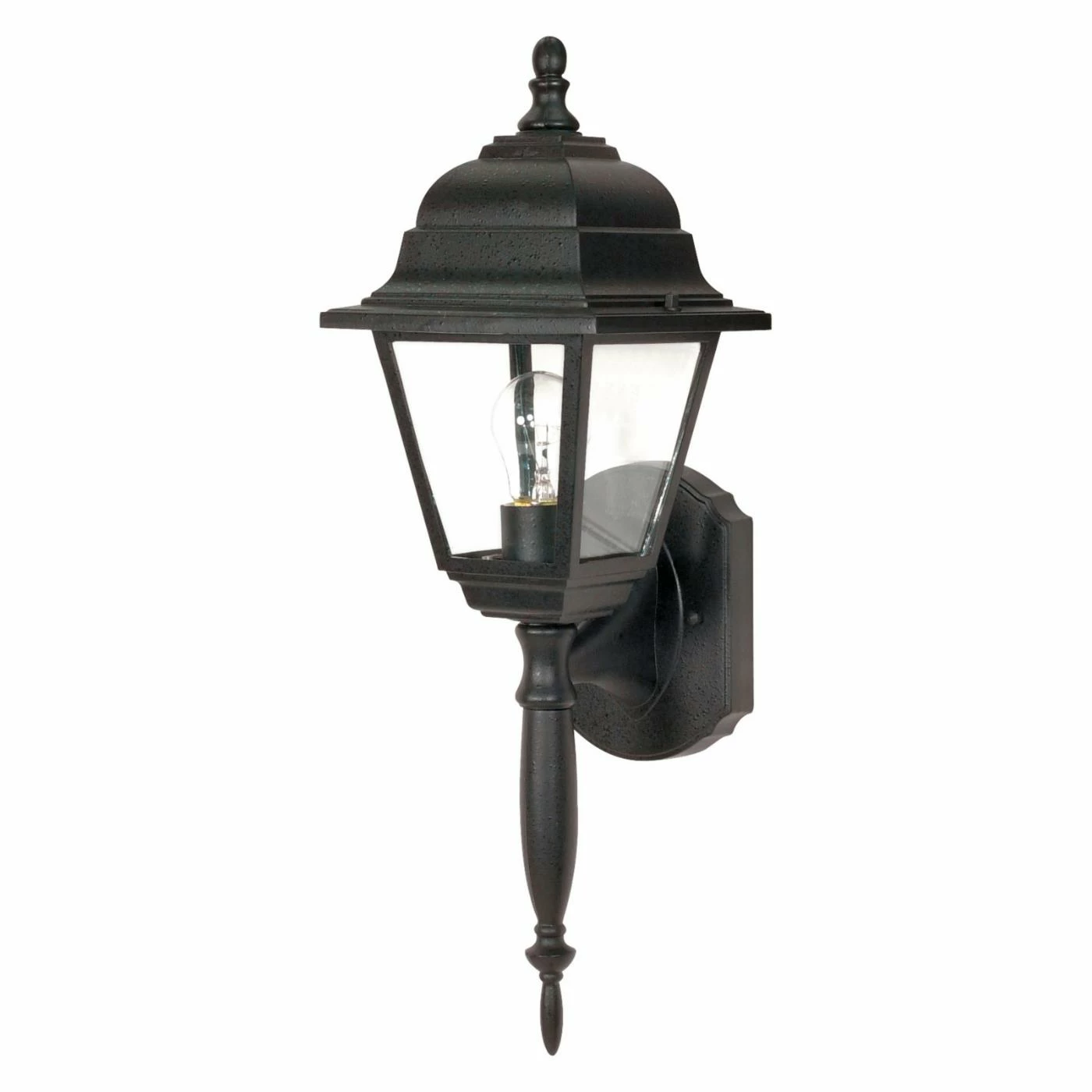 The Nuvo Briton 18 in. Wall Lantern boasts a sleek, clean design that works well with traditional and contemporary home designs. The domed hood and thick angled lines create a sturdy appearance and the clear glass brings balance with an air of delicacy. It’s a single-bulb fixture and it attaches from the back with an extremely discreet wall mount.