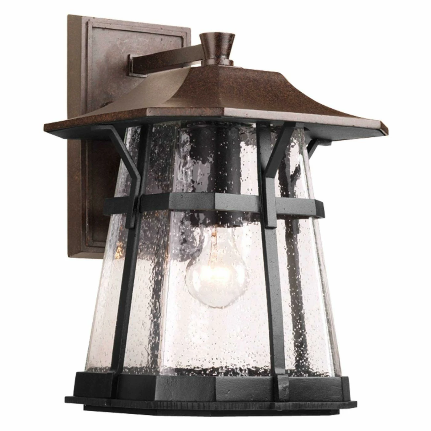Illuminate your entryway with the Progress Lighting Derby One-Light LED Outdoor Wall Sconce. This wall sconce is constructed of powder-coated cast aluminum. The roof and back plate feature an espresso finish, and the frame features a textured black finish. The single bulb is surrounded by a clear seeded glass diffuser. This fixture requires one 100-watt incandescent bulb (not included).