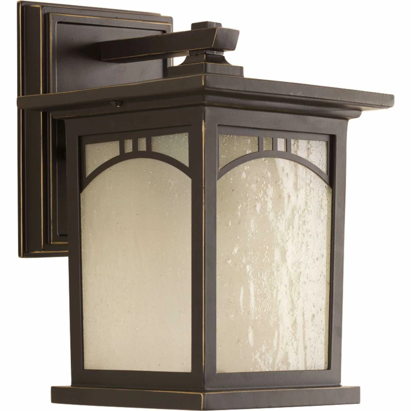 A perfect complement for Asian decors or sharp modern homes, the Progress Lighting Residence Outdoor Wall Sconce is an attractive, comforting light source for your home’s exterior. Its aluminum frame has a pagoda-style lantern with a rectangular mounting bracket, protected from the elements by a powder-coated antique bronze finish. Seeded amber glass panels conceal the socket, diffusing the light. The piece is designed for a 100-watt bulb (not included). Choose among the available sizes. Professional installation is recommended.