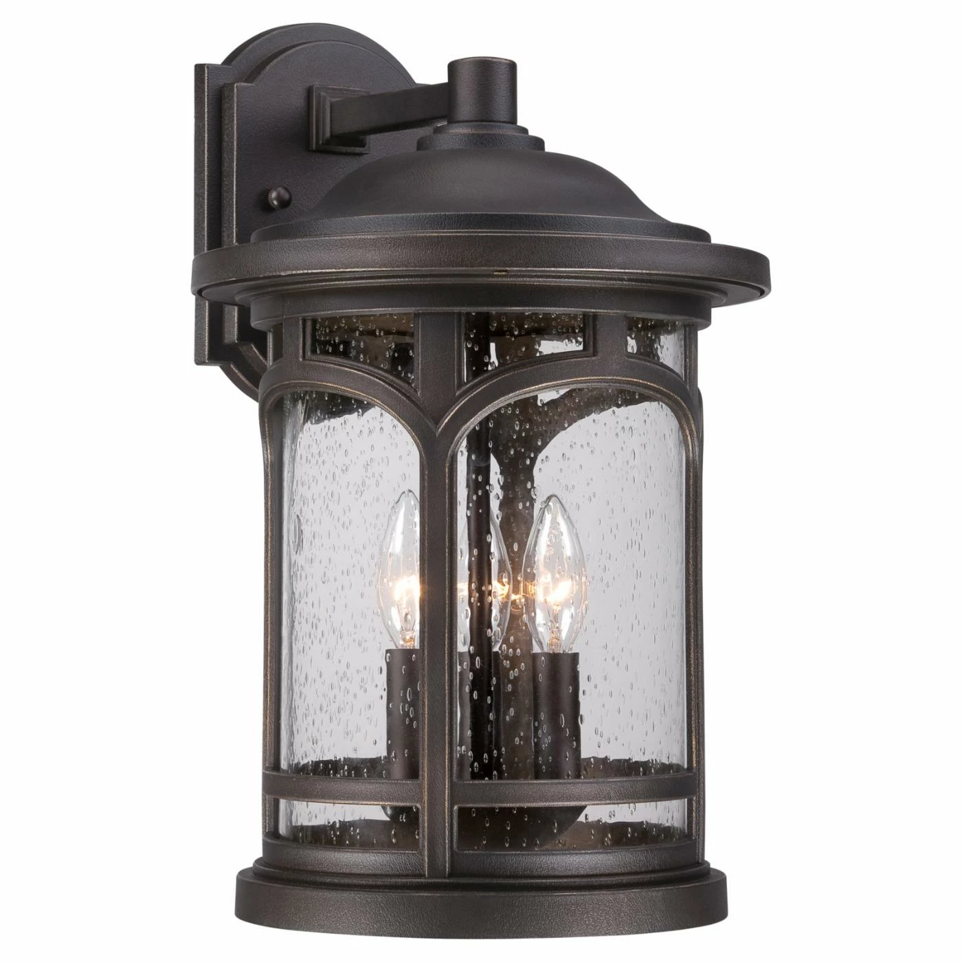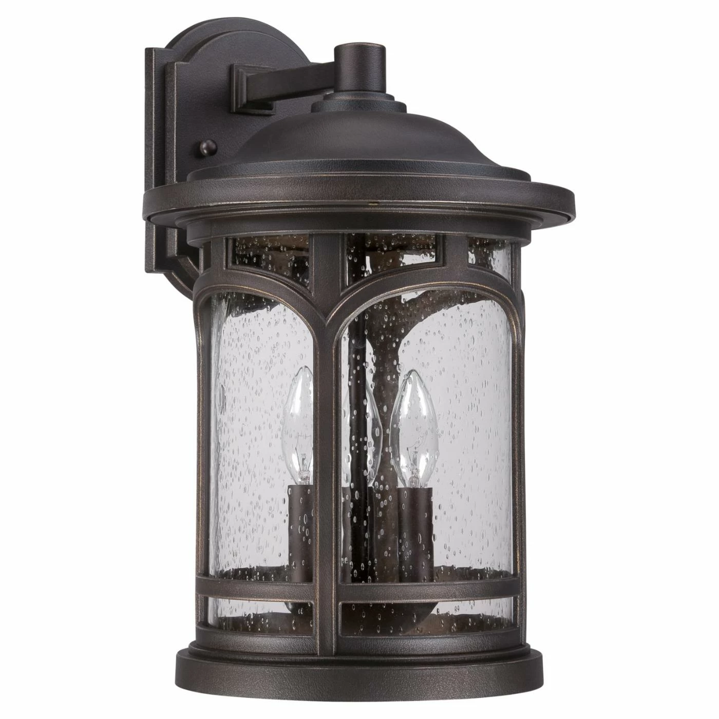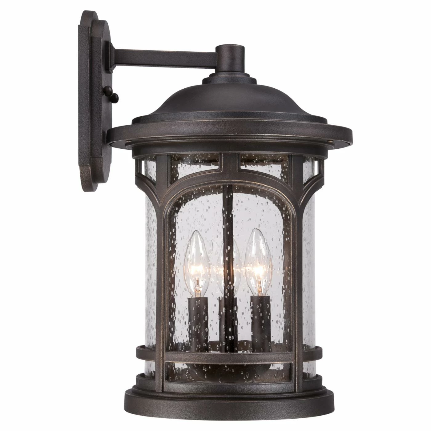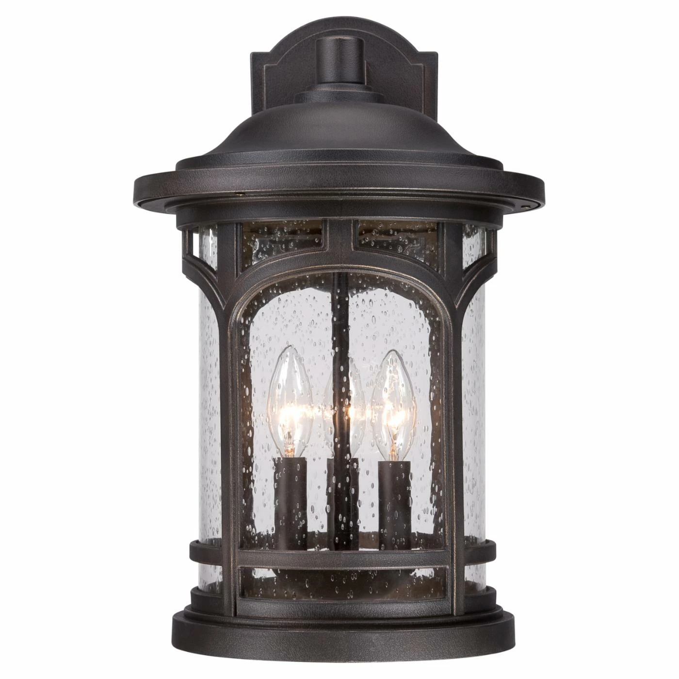 To create its distinctively masculine style, the Quoizel Marblehead MBH8411PN Outdoor Wall Lantern finishes its stately arches in Palladian bronze and completes the look with a seedy glass cylinder shade. This outdoor wall lantern requires three 60-watt bulbs, not included.