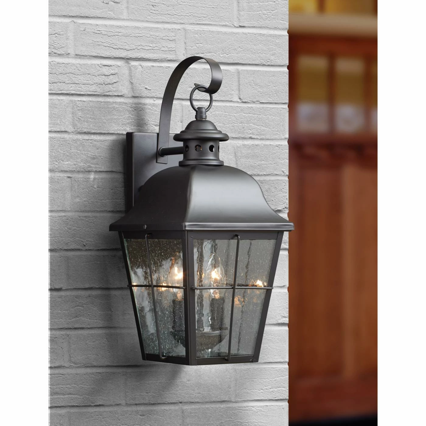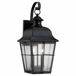 With its classic lantern design in mystic black and seeded glass panels, the Quoizel Millhouse MHE8409K Outdoor Wall Lantern is sure to welcome guests to your home in style. Bulbs for this outdoor wall lantern are sold separately.