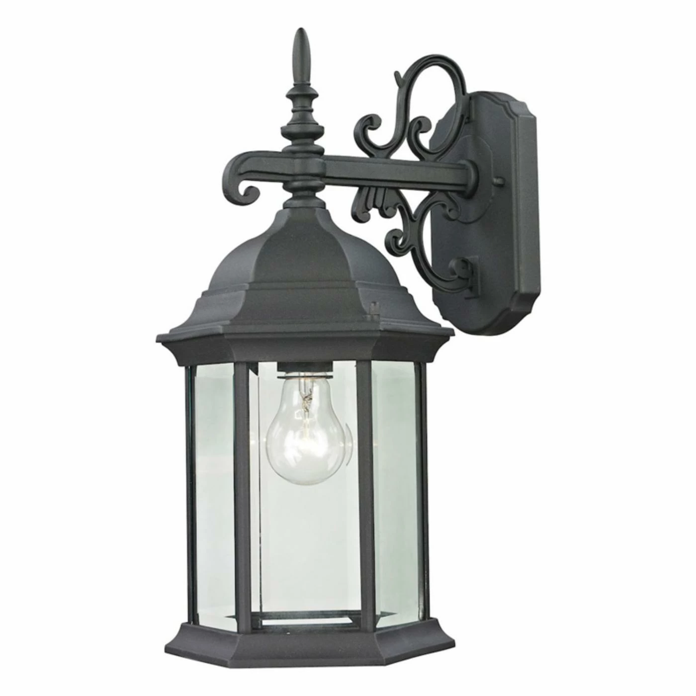 A dramatic finial and scrollwork accents give the Thomas Lighting Spring Lake Traditional Outdoor Wall Sconce a sophisticated, vintage vibe. Although the fixture is fabricated out of rustproof aluminum, its matte textured black finish offers the visual appeal of wrought iron. Clear beveled glass panels protect the single downlight.