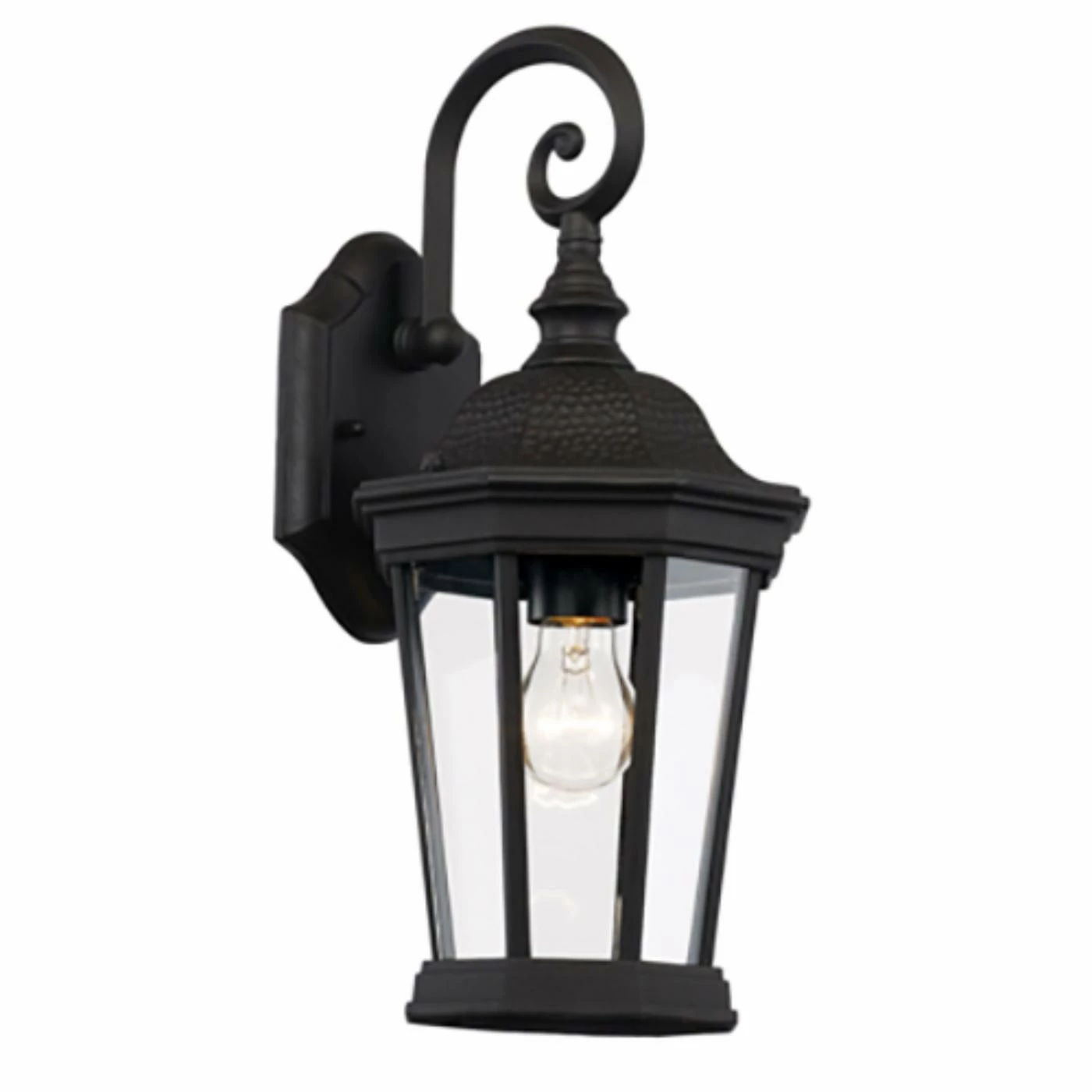 Enhance your home with texture and light when you hang the Trans Globe Lighting Westfield 40400 BK Outdoor Wall Lantern. A mottled cap with finial-inspired break dangles from a pointed scroll arm. A cameo wall mount is classic and elegant.