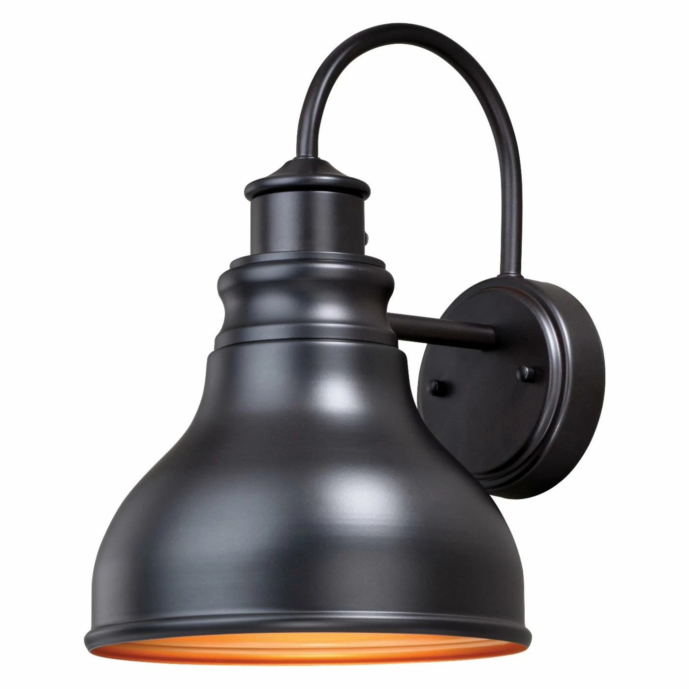 The Vaxcel Delano T0316 Outdoor Wall Light exudes a masculine air with a two-toned finish featuring and outer warm oil burnished bronze and a light gold interior. The rugged steel construction ensures years of use. The industrial-inspired design adds a unique look to your porch, patio, or front door.