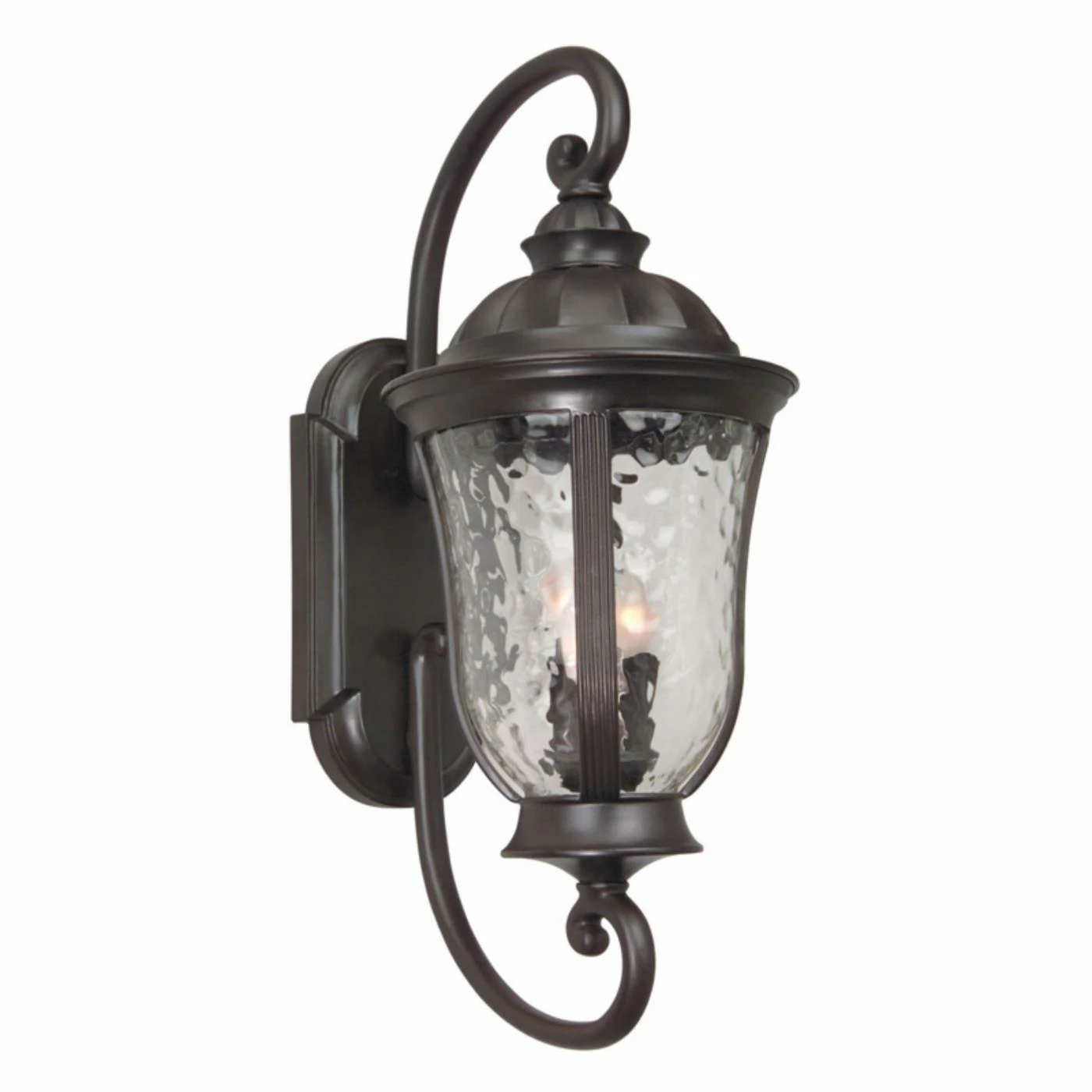 The Craftmade Frances Z60 Outdoor Wall Light is supported by two scrollwork arms at the top and bottom that bring it a sense of pure elegance. This unique outdoor wall light features a rich oiled-bronze finish, and the teardrop-shaped shade is emboldened with hammered glass for added visual depth.
