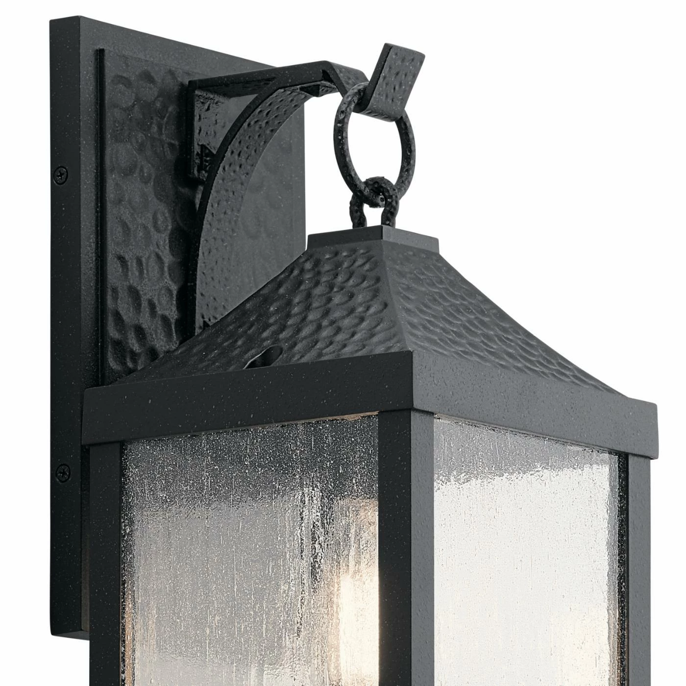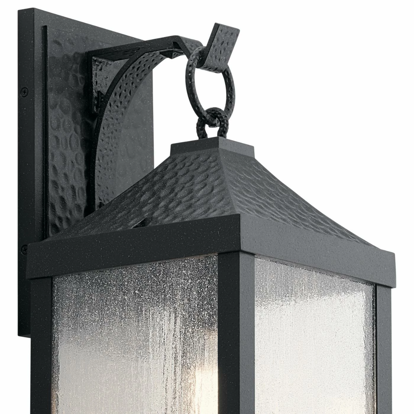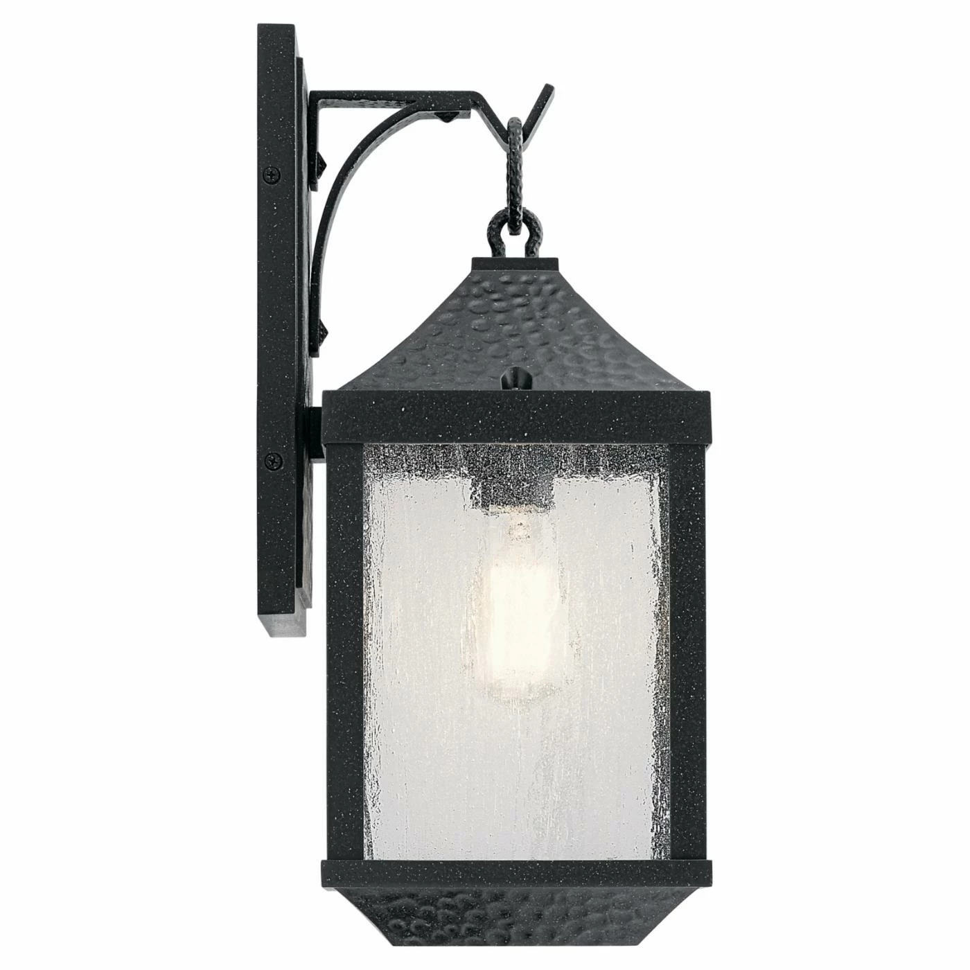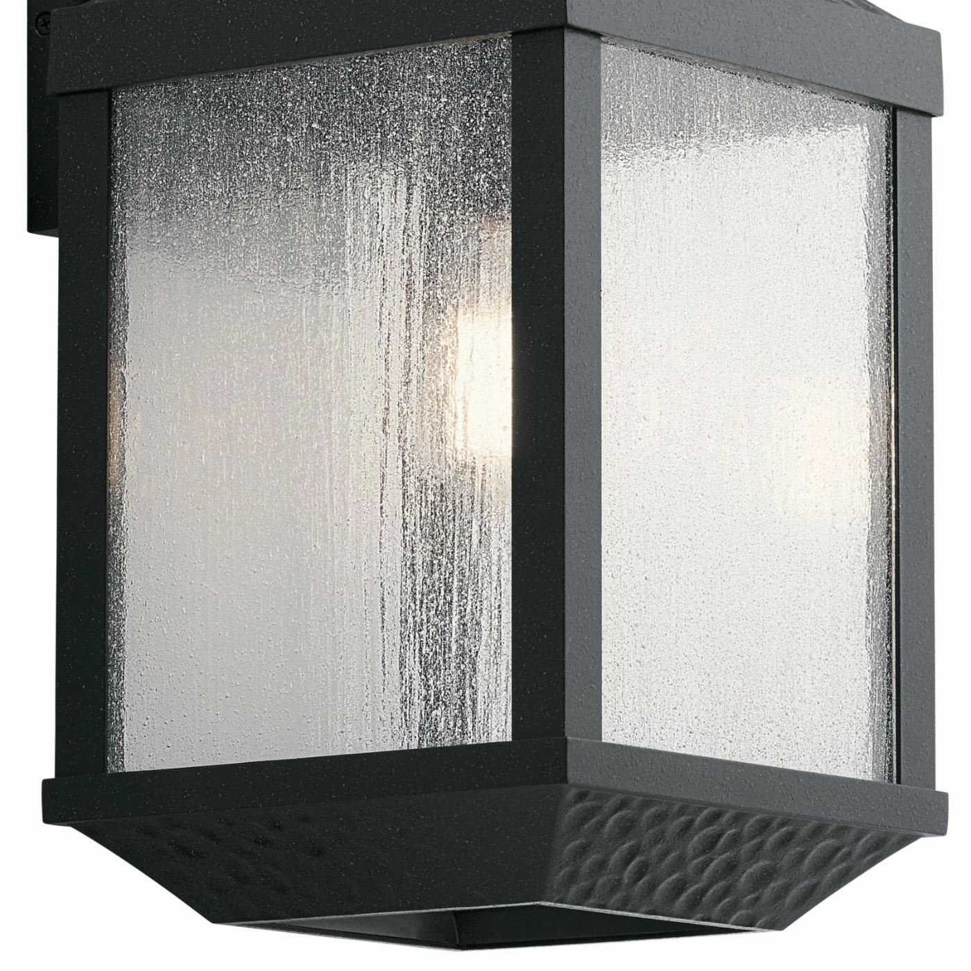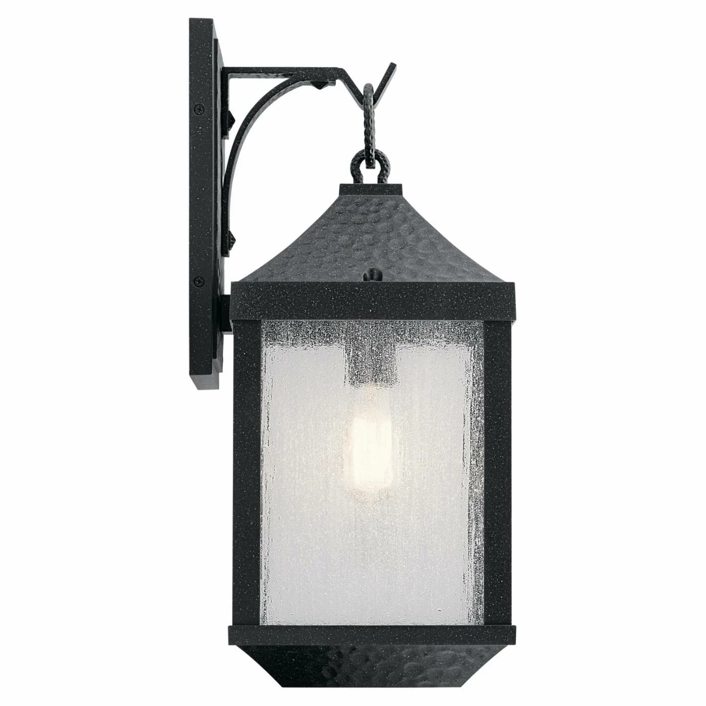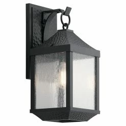 Brighten up your home’s yard, driveway, or walk with the Kichler Springfield 4998 Outdoor Wall Lantern. This durable, outdoor-rated lantern is designed for wall-mounted installation with an aluminum frame. The metal is dimpled and finished in a distressed black color. Clear rain-glass panels protect the socket. Bulbs are not included.