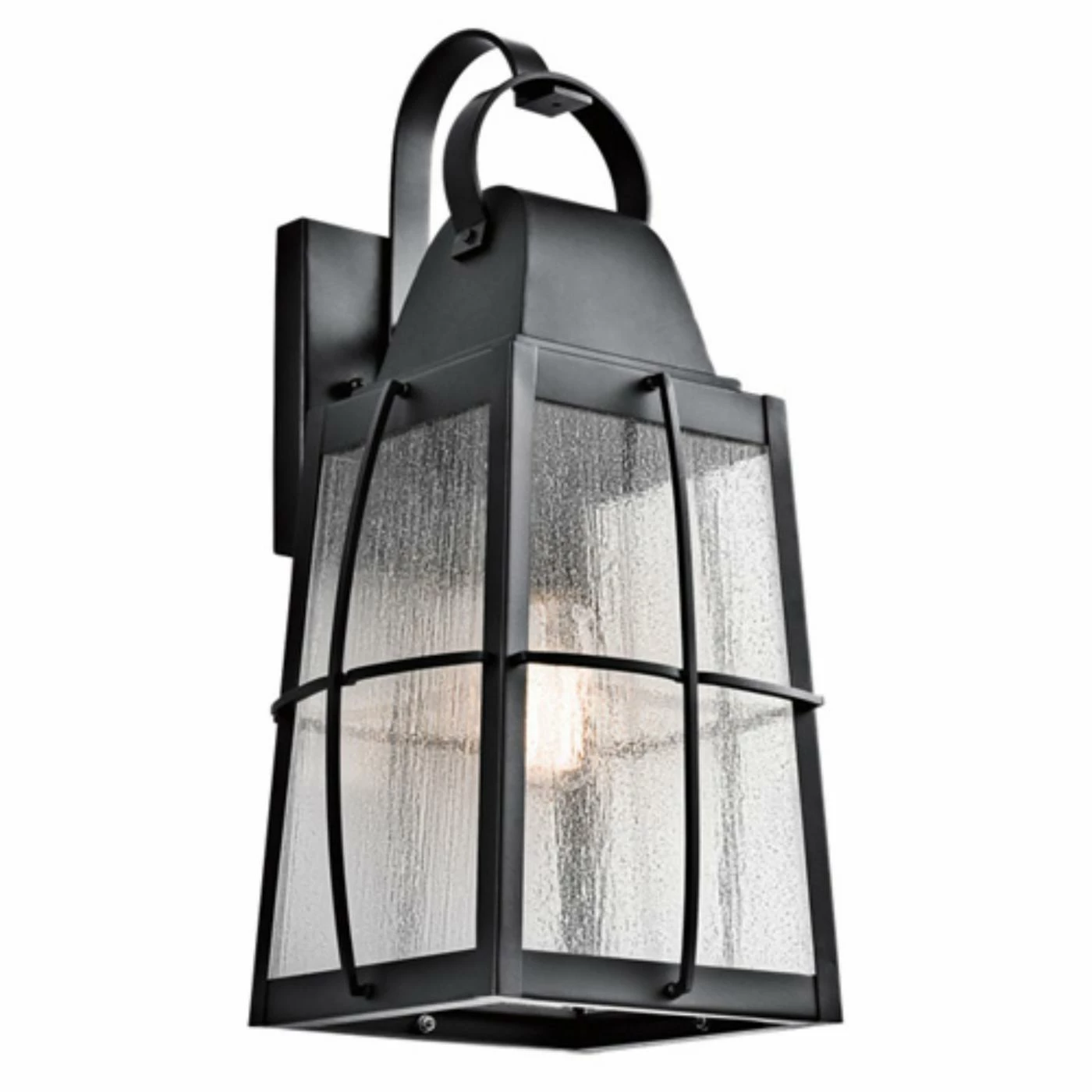 To create its carriage lantern appeal, this Kichler Tolerand 49554BKT Outdoor Wall Sconce features a classic black finish, wire details, and clear seeded glass panels. This outdoor wall sconce requires one 150-watt incandescent bulb (not included).