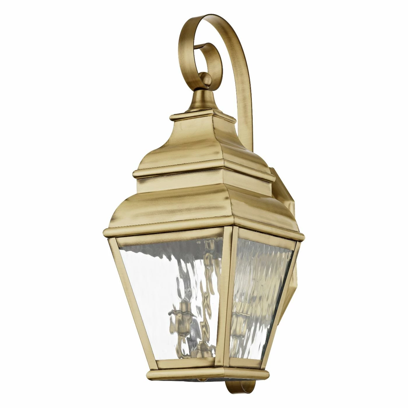 Add the rustic Livex Lighting Exeter 2602-01 Outdoor Wall Lantern to your home to welcome guests to your home and safely illuminate walkways. The two 60-watt bulbs are softly diffused by textured glass for an antique candelabra-inspired look. The antique brass finish completes the look with warm allure.