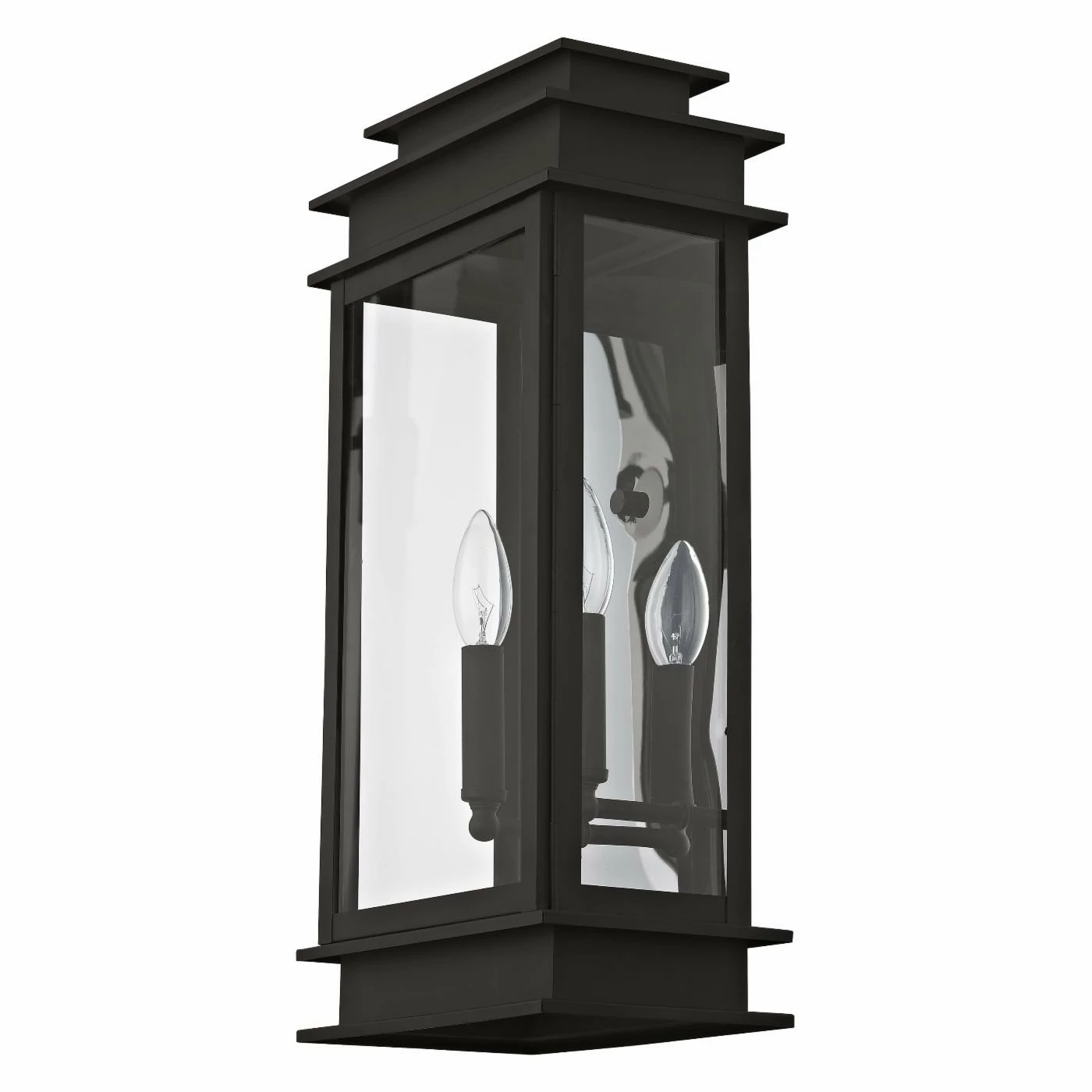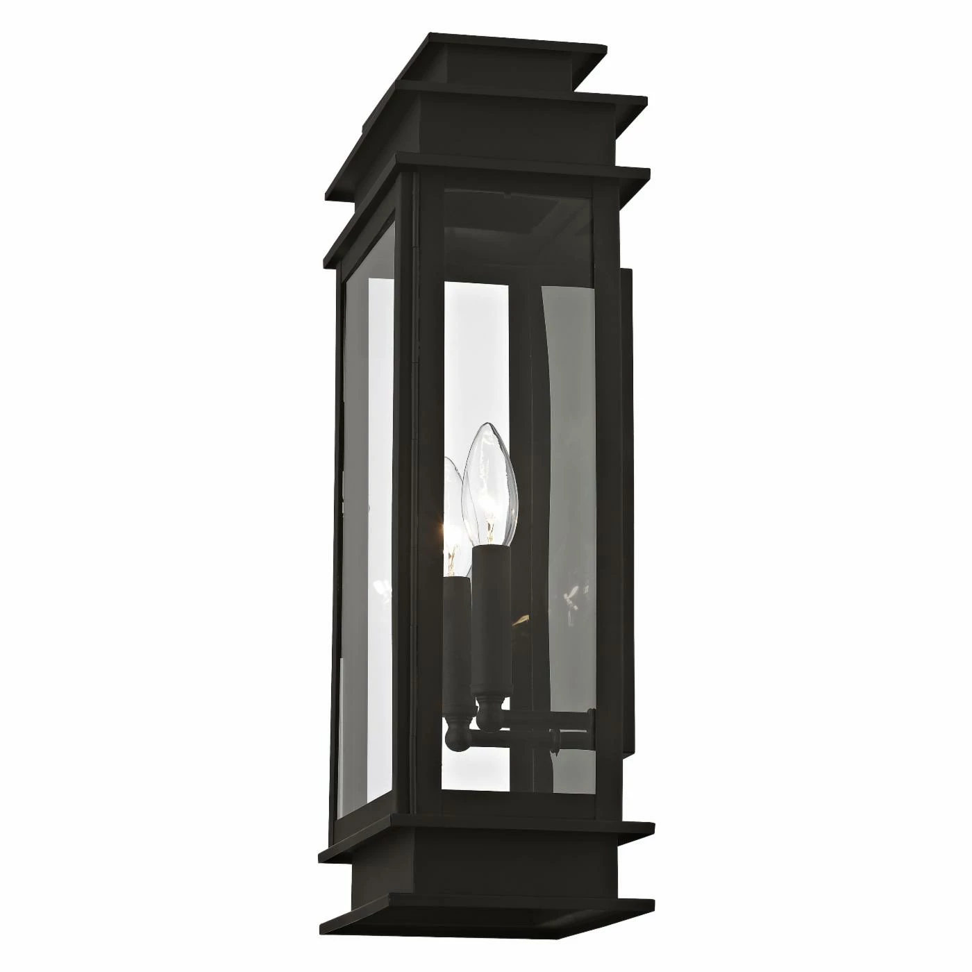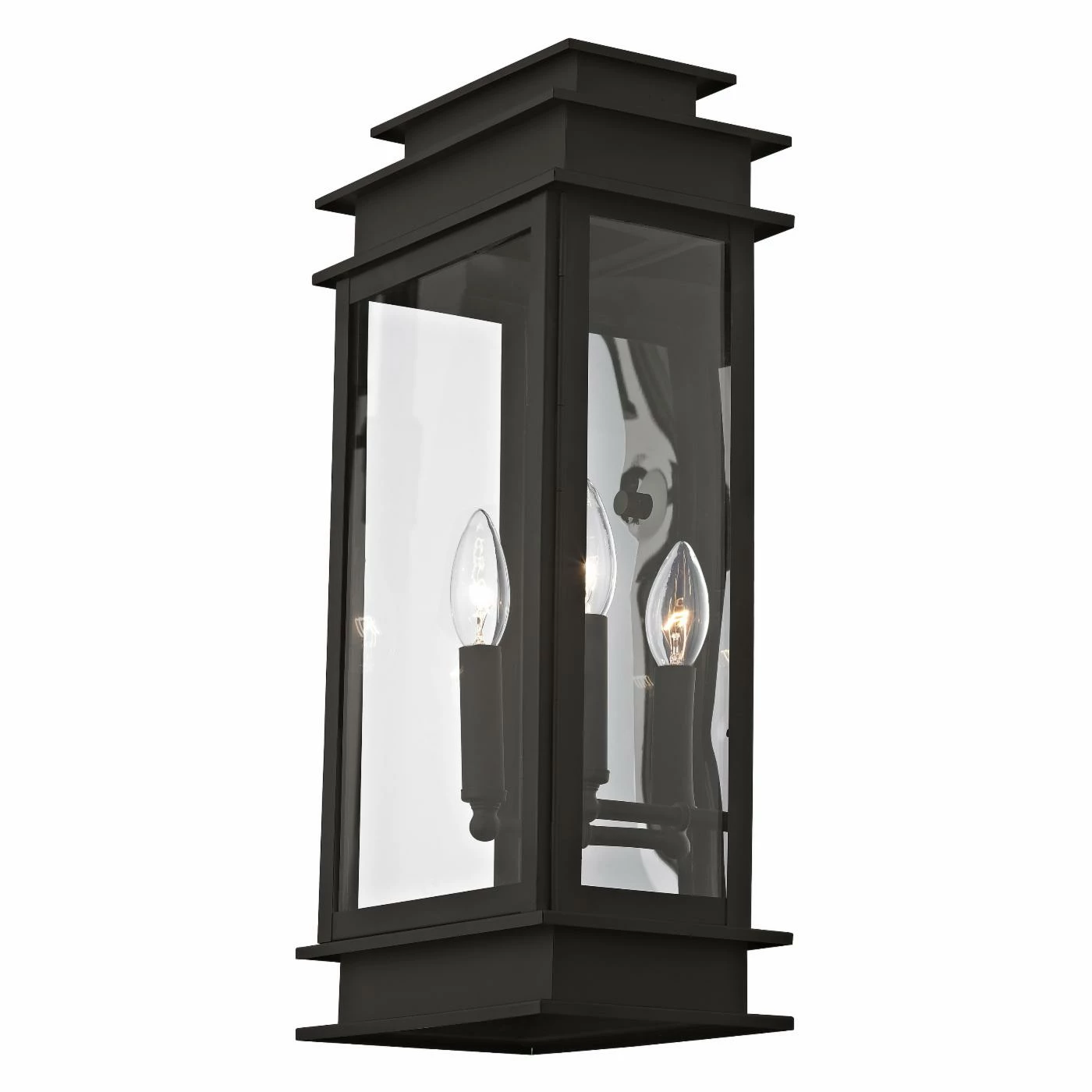 Channel old world charm when you make this Livex Lighting Princeton 2018 Outdoor Wall Lantern part of your home’s outdoor setup. It features a square fixture design, clear glass shade, and is offered in your choice of available finish. This wall lantern requires two 60-watt incandescent bulbs (not included).