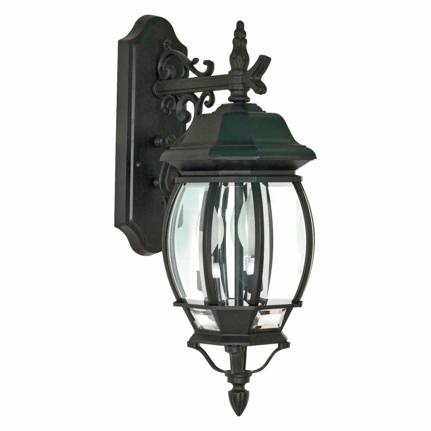 Create an elegant impression with the Nuvo Central Park Three Light 22 in. Arm Down Wall Lantern. It has a rounded globe with clear beveled glass, which creates an intriguing show of the candelabra bulbs while the frame’s prominent lines add a sturdy, structured appearance. This fixture is attached by a decorative arm that connects at the top, creating a lantern effect and adding additional embellishments.