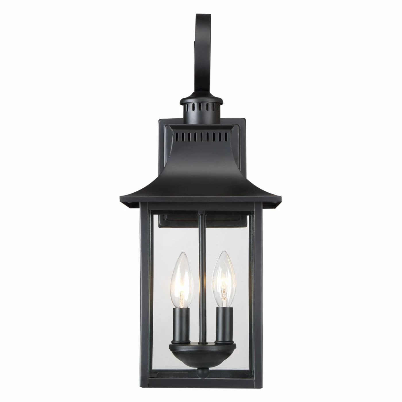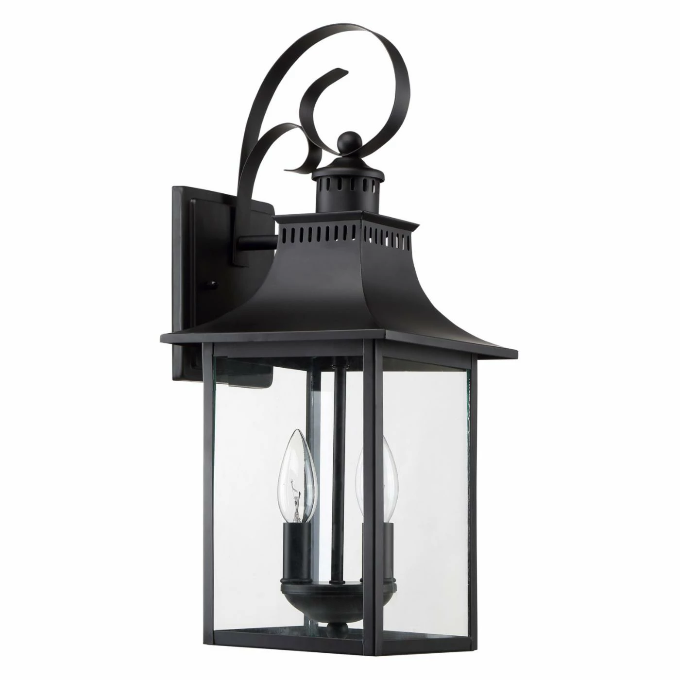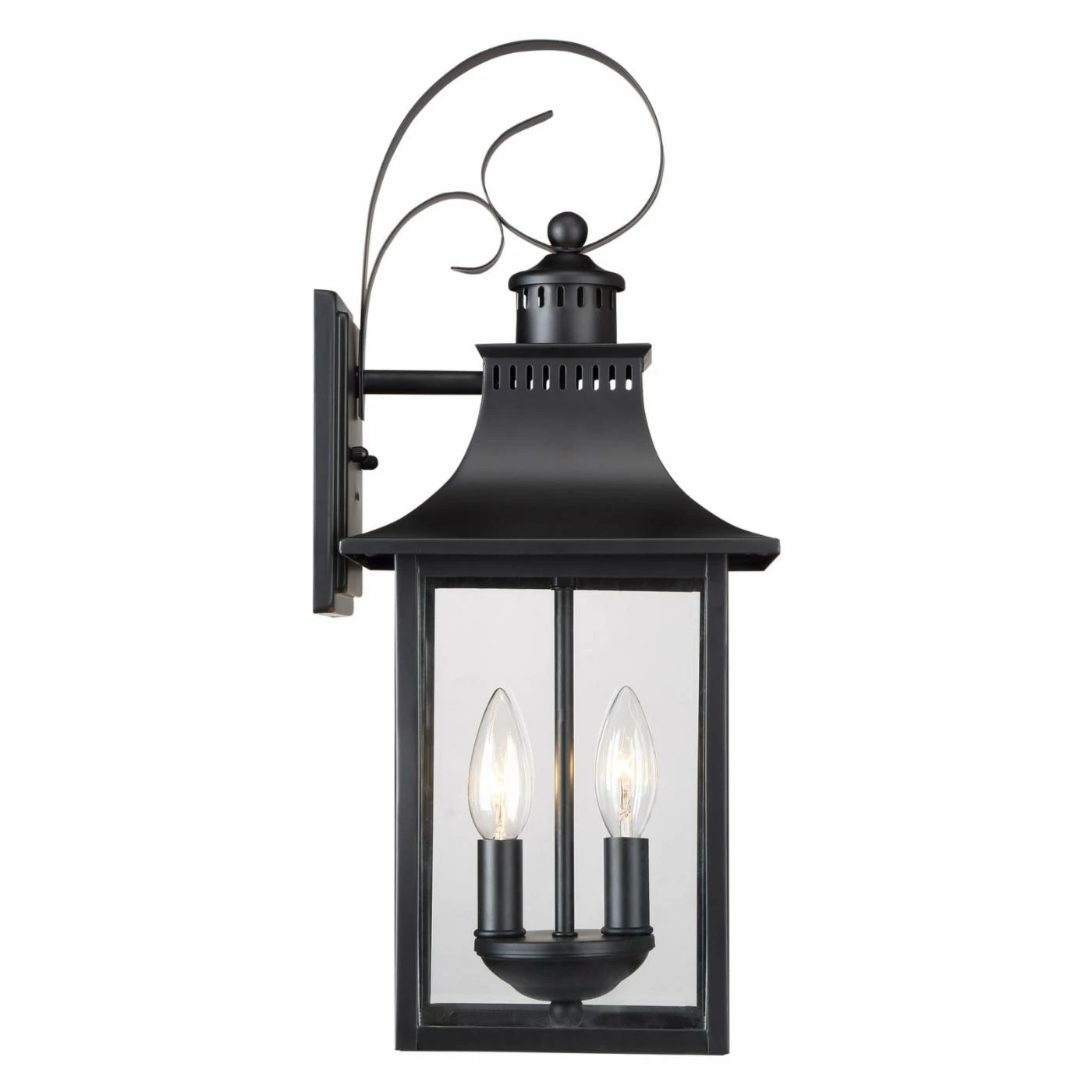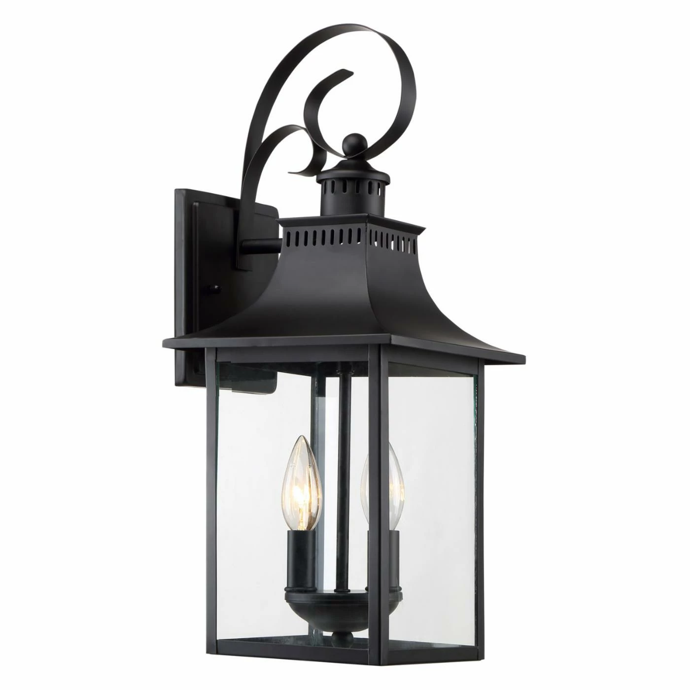 Add a touch of old world charm to your home with the Quoizel Chancellor CCR8408K Outdoor Wall Lantern, featured with steel construction and a dramatic mystic black finish. This timeless outdoor wall lantern holds two candelabra bulbs behind clear glass panels for a bright glow. A scrolled arm and curved top bring it a chic and attractive silhouette.