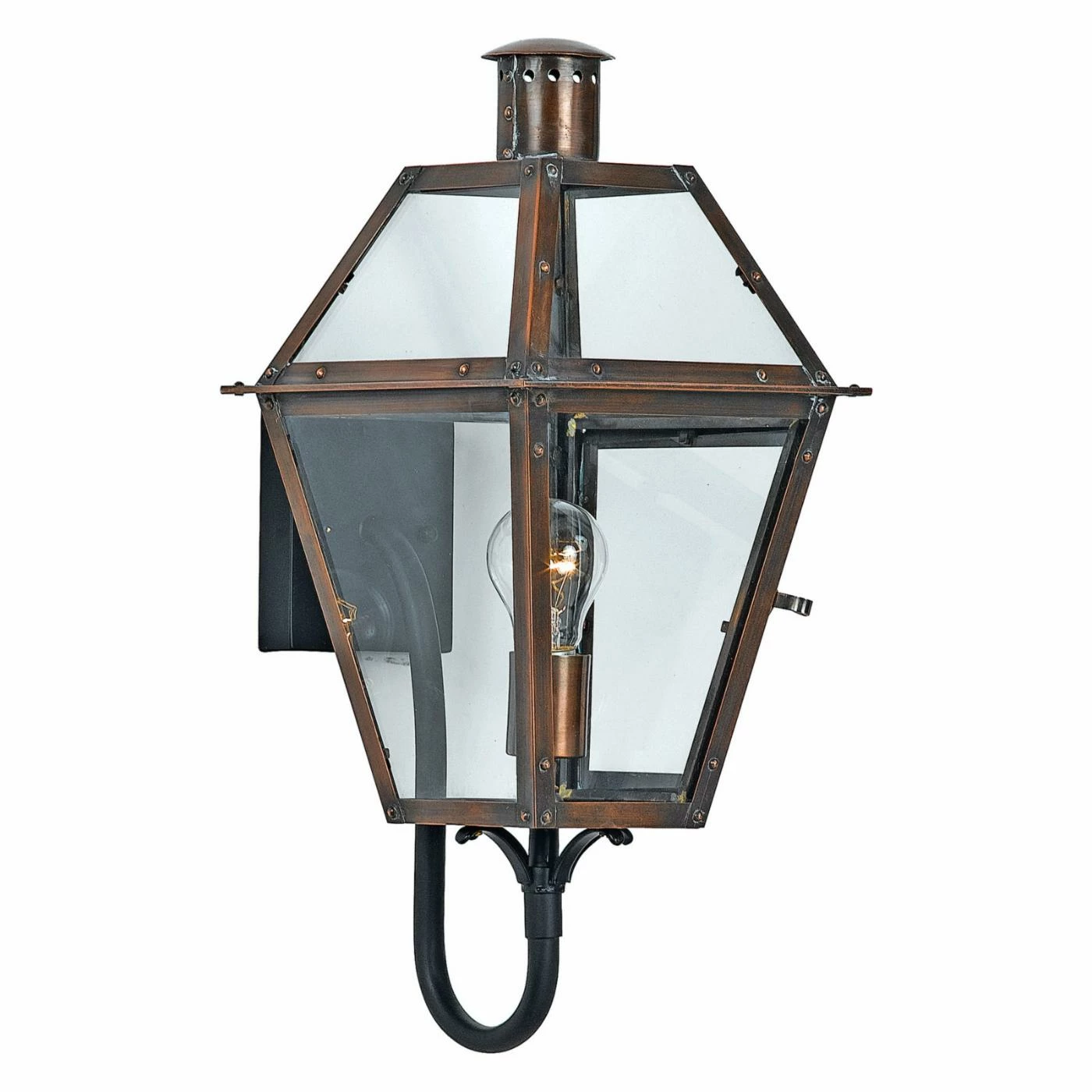 Inspired by designs found in historic Charleston and New Orleans, the Quoizel Rue De Royal RO8410AC Outdoor Wall Lantern is vintage appeal at its finest. If this outdoor wall lantern looks something like the gas lights of yesteryear, you’re right; but this lantern is all electric – no messy propane required. The hand-riveted copper frame is finished in an aged copper color, while the panels are made of transparent glass. You’ll need one 100-watt medium base bulbs (not included).