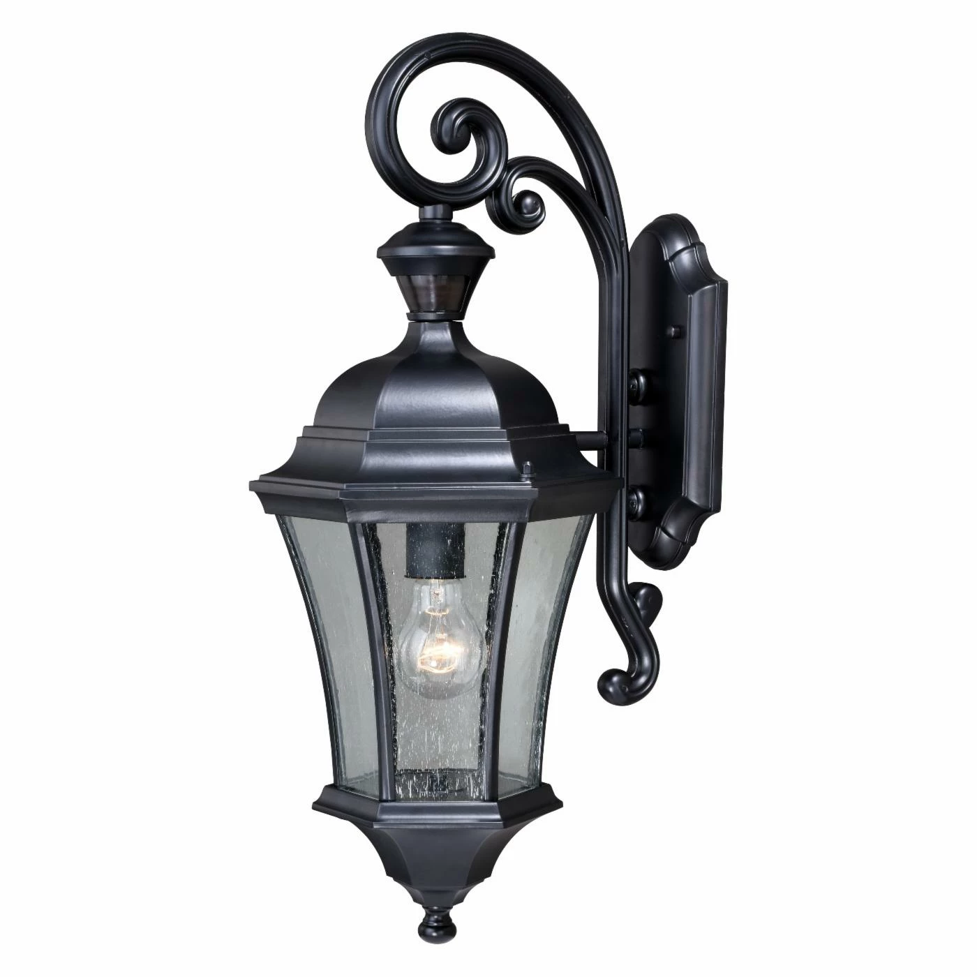 Craft a regal entrance to your home with the Vaxcel Aberdeen Dualux T0320 Outdoor Wall Light, featuring a dramatically scrolled arm and sophisticated lantern design. Made from durable aluminum, this attractive wall light has a sleek shiny black finish. Clear seeded glass panels add a handsome finishing touch.