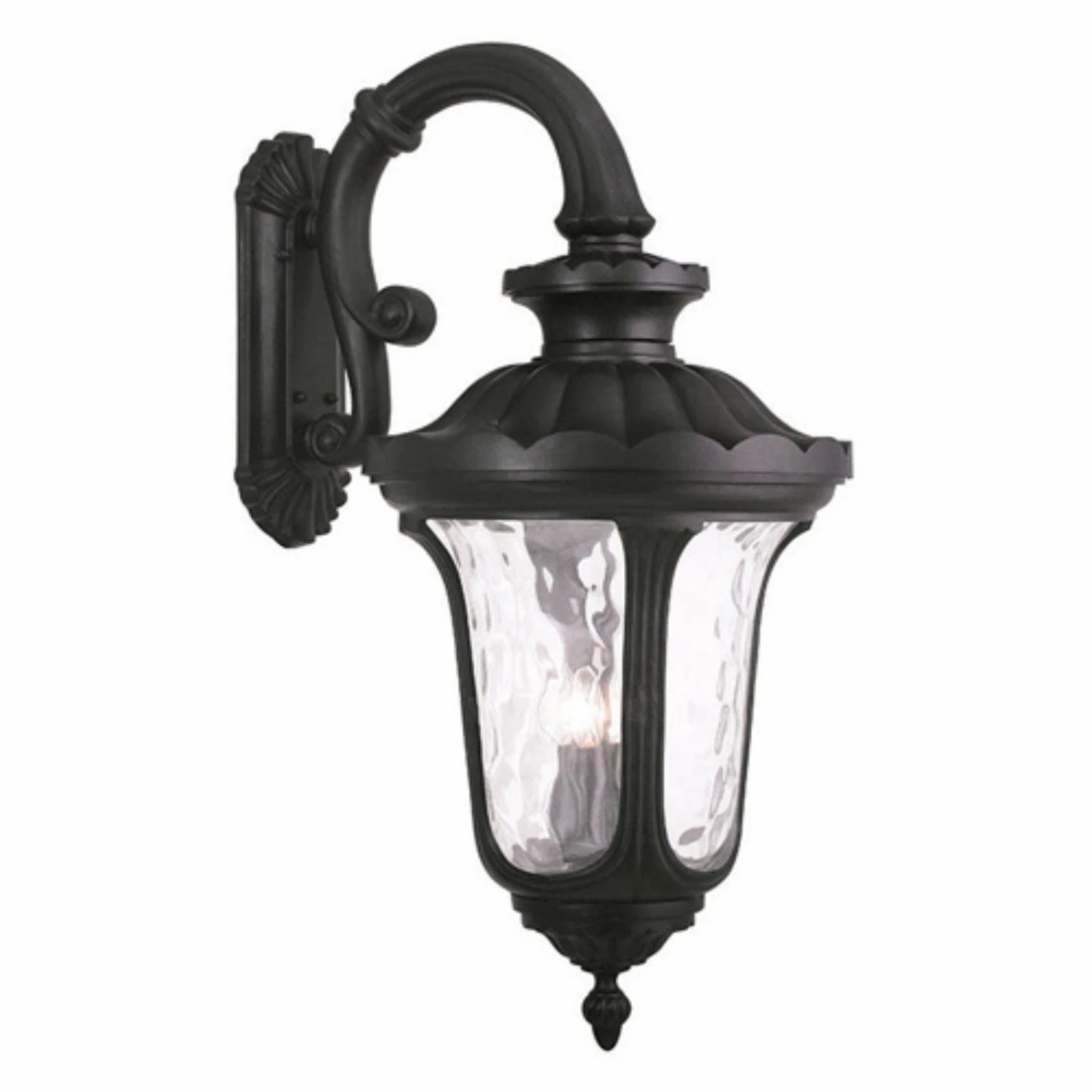 Welcome guests in proper English style with this Livex Lighting Oxford 78701 Outdoor Wall Lights. Its traditional lantern shape is graced with elegant details, a dapper black finish, and luxurious hand blown clear water glass panes. This outdoor wall light requires four 60-watt candelabra base bulbs, not included.