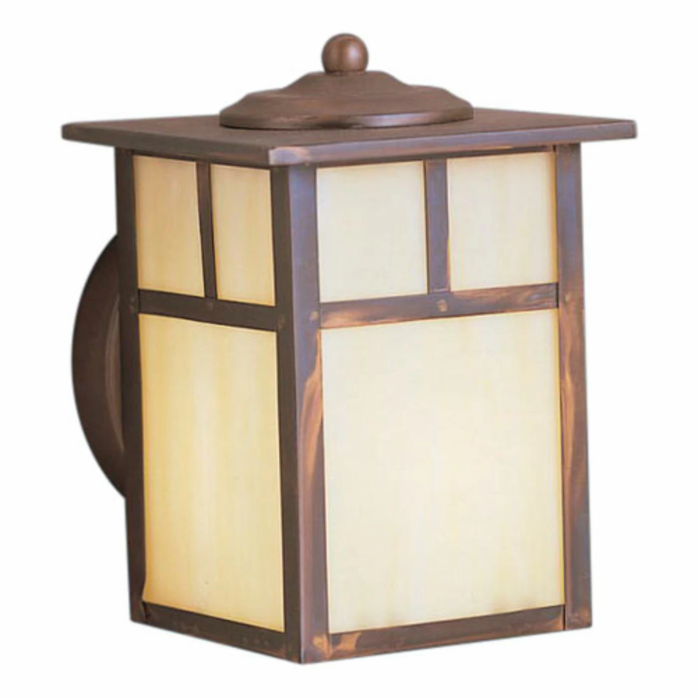 The Kichler Alameda Outdoor Wall Lantern is the smallest lamp in the Alameda lantern collection. Its demure size is just right for subtle accent lighting for doors or windows. This lantern’s clean, straight lines and simple Arts and Crafts/Mission-style design make it a perfect blend of modern and classic sensibilities. The Alameda’s classic lantern shape is crafted from solid brass with a Canyon View finish, and its honey opalescent glass panels give off a subtle yet radiant glow. This light requires one 100-watt incandescent bulb (not included), and is UL-listed for wet locations. Additionally, panels that address Dark Sky guidelines are available separately for this lantern. Measures 5.5L x 5W x 7H inches.