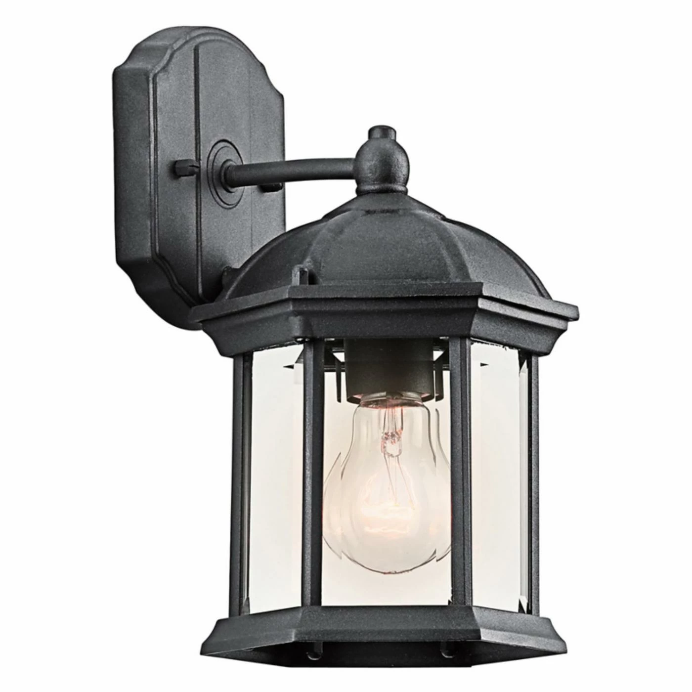 The Kichler Barrie 49183 Outdoor Wall Lantern – 6.25 in. will spread a beautiful glow on the porch and around your prized flower pots. Traditional and rustic in design, this wall-mounted lantern will give your front door a quaint look. Itβs clear glass lamp has an aluminum body with a dome on top. This light accessory holds one 100W A19 bulb (not provided). Designed in traditional style, this lamp will complement any home decor.