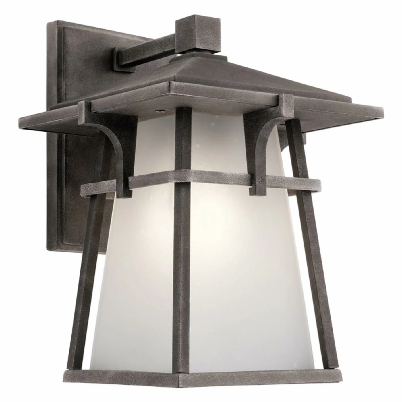 The Kichler Beckett 49721 Outdoor Wall Light brings the beauty of the Orient to the outside of your home with a modern spin on a classic pagoda shape. This truly stunning light is accented with a gorgeous etched seeded glass shade that adds a soft, delicate look. Includes L18 bulb (3000K, offers 92 CRI, 800 lumens, dimmable, and uses 10 watts).