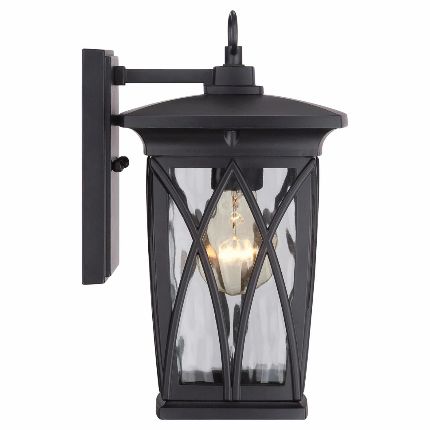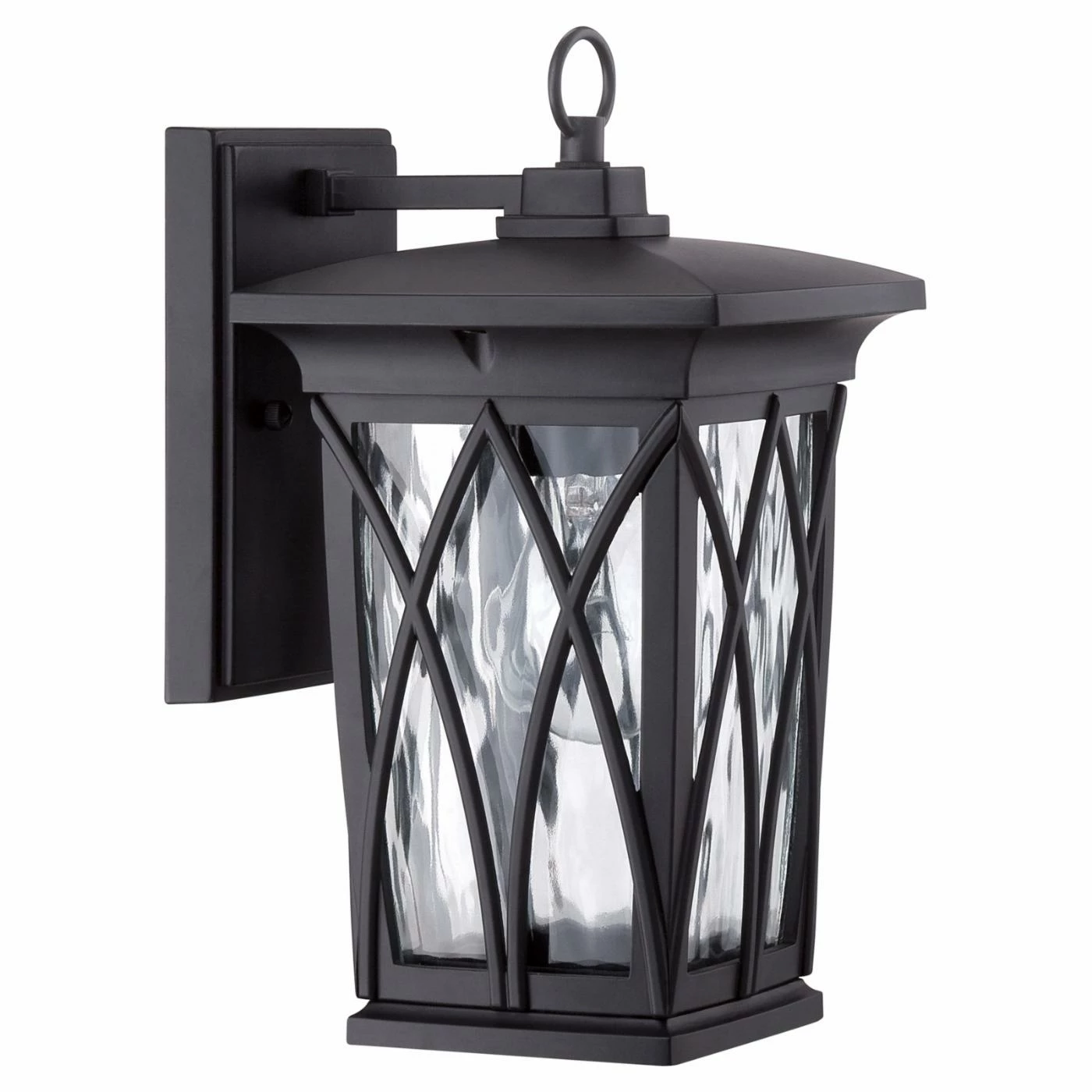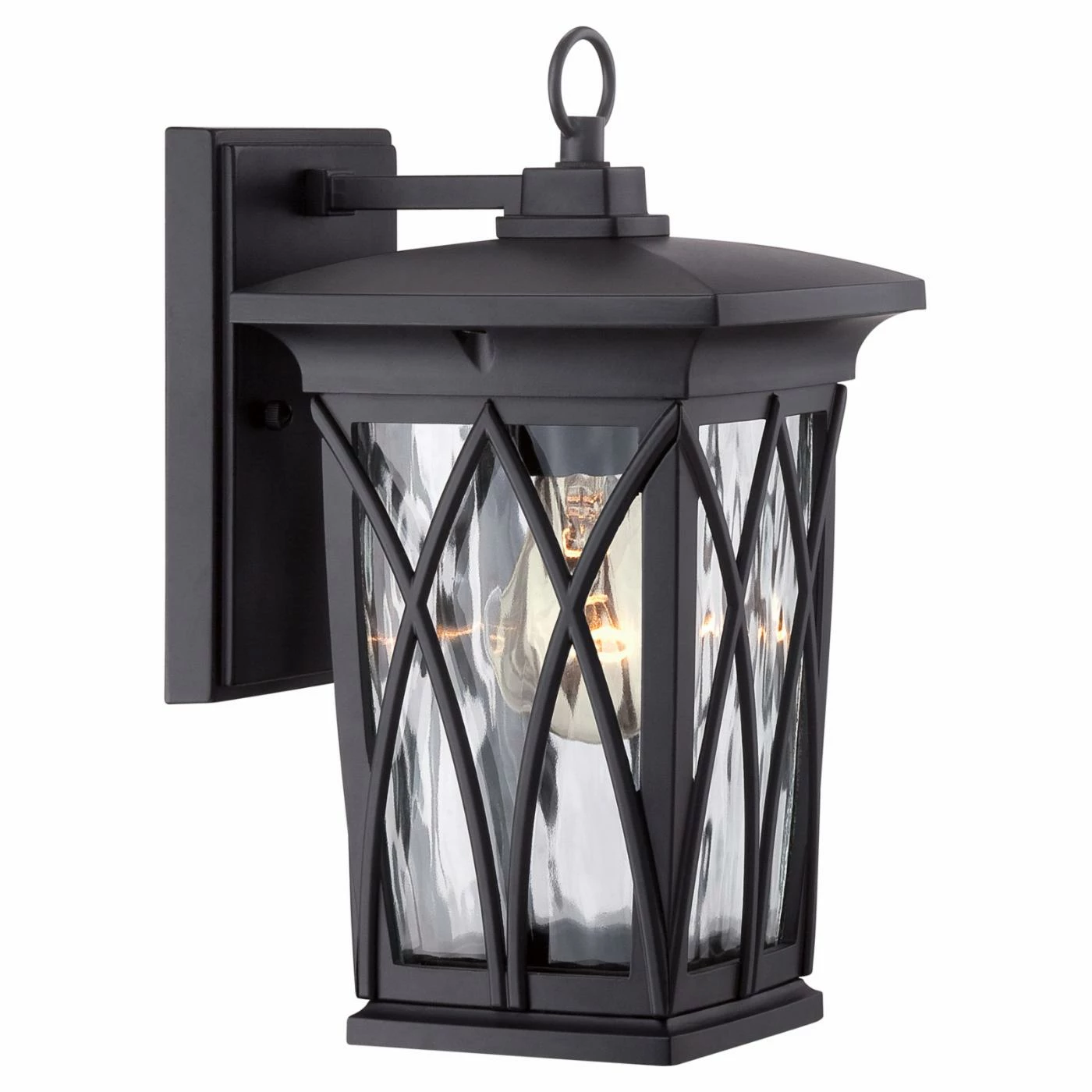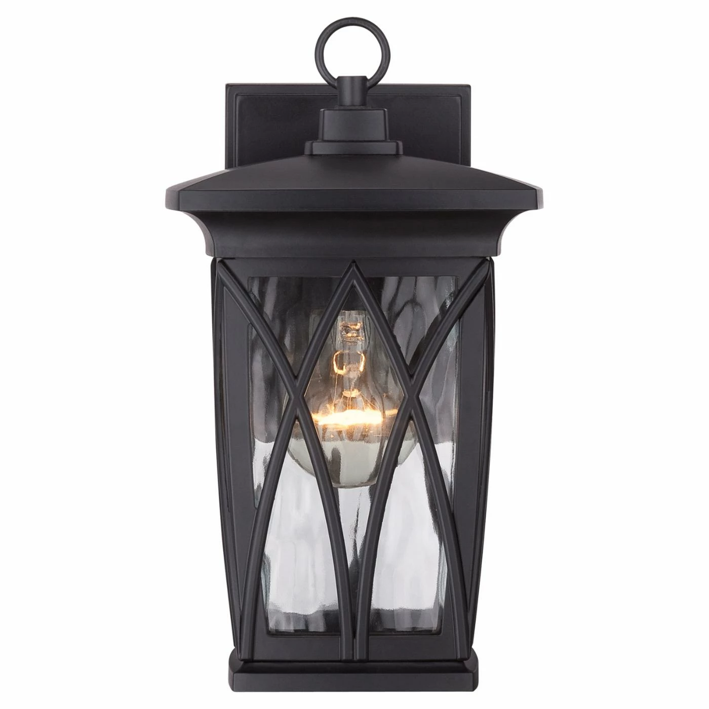 The curved X overlays on this Quoizel Grover GVR8406K Outdoor Wall Lantern showcase the clear water glass shades beneath. This outdoor lantern comes in a mystic black finish and includes a vintage style bulb.