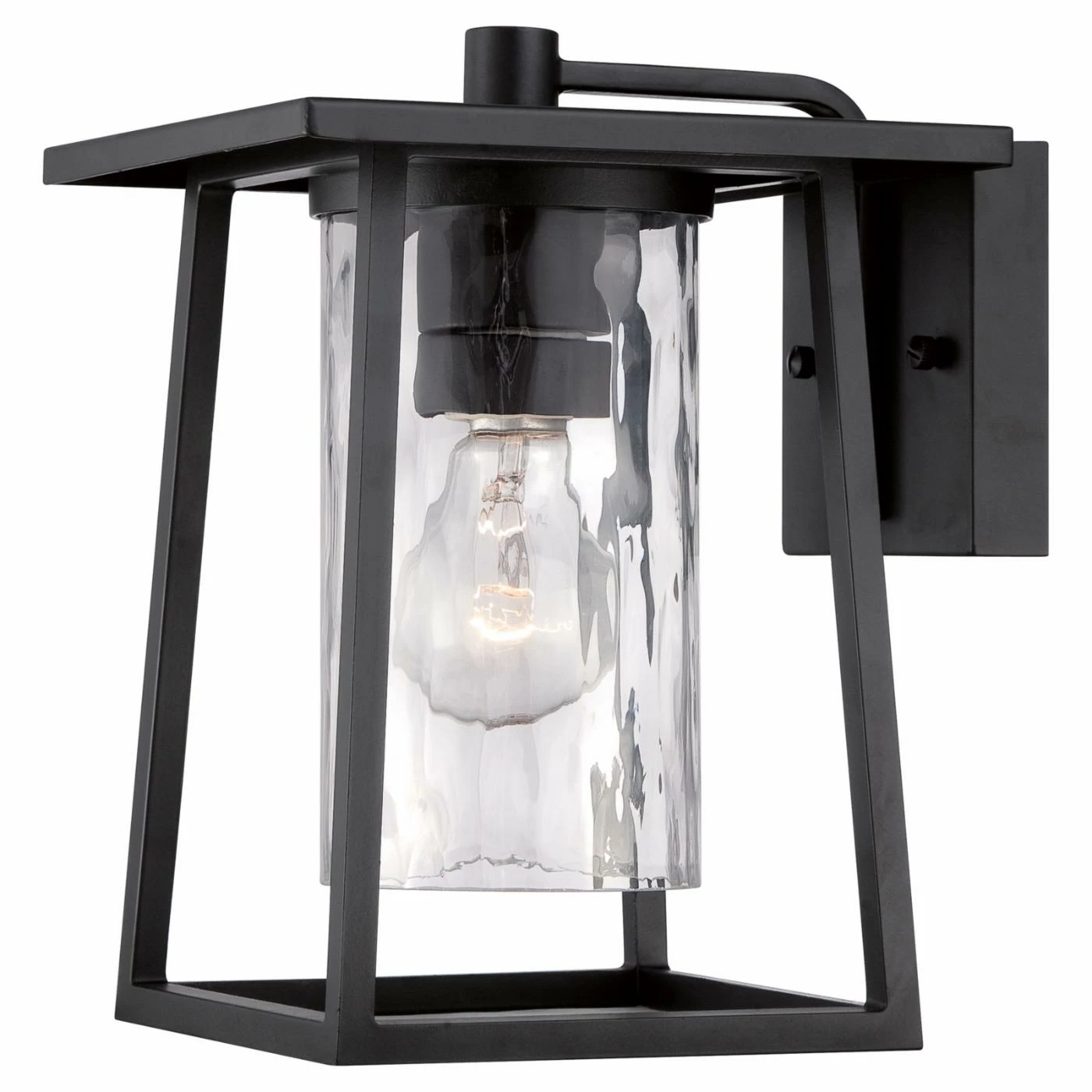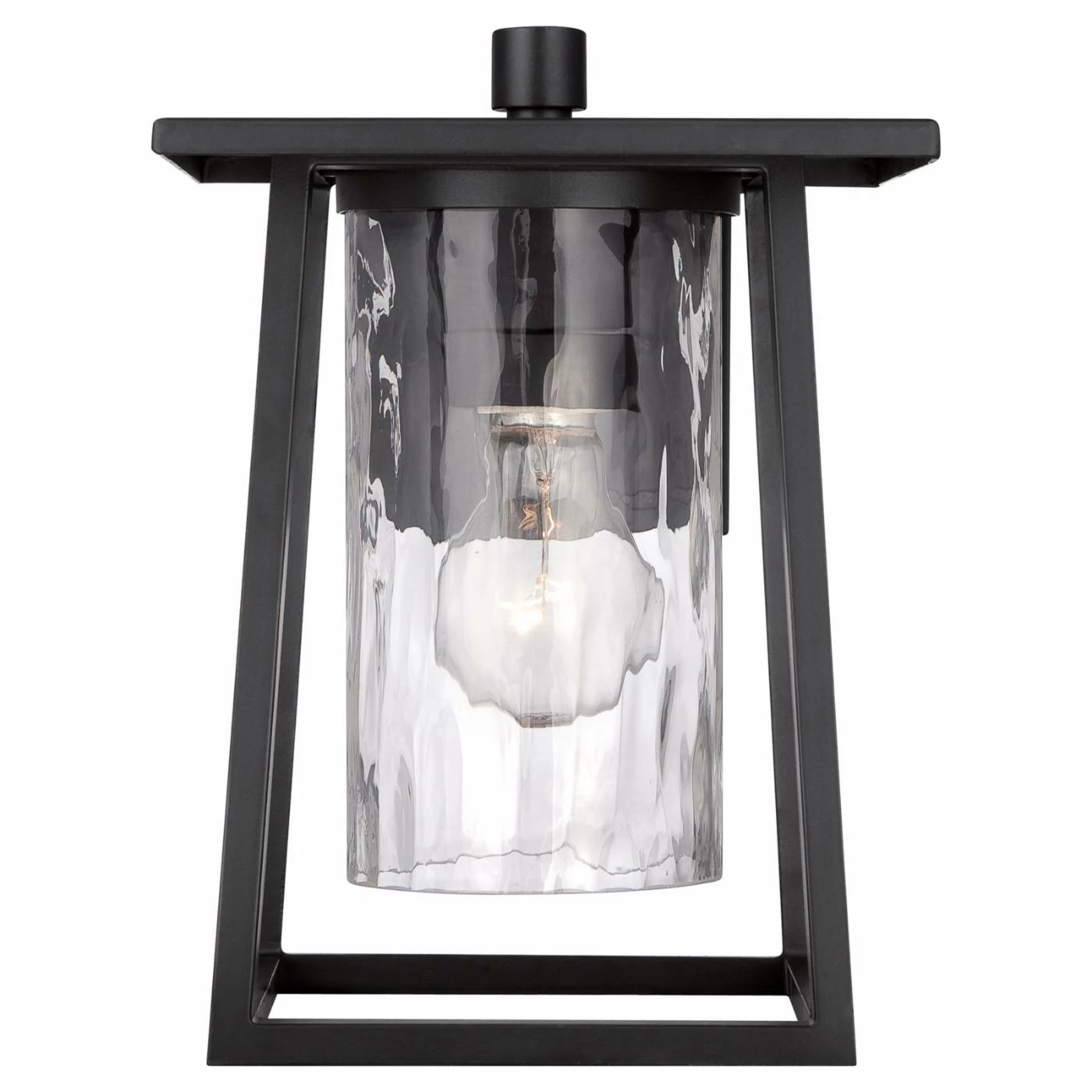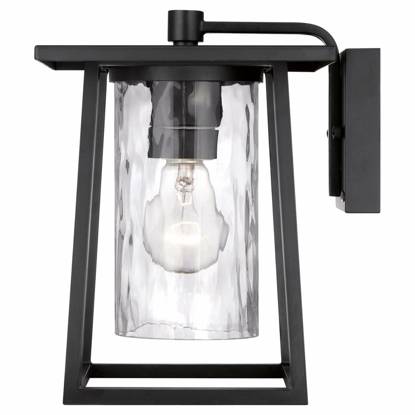 The simple yet profound Quoizel Lodge LDG8408K Outdoor Wall Lantern has an open cage frame in mystic black, a distinctive clear hammered glass cylinder shade, and one vintage style bulb.