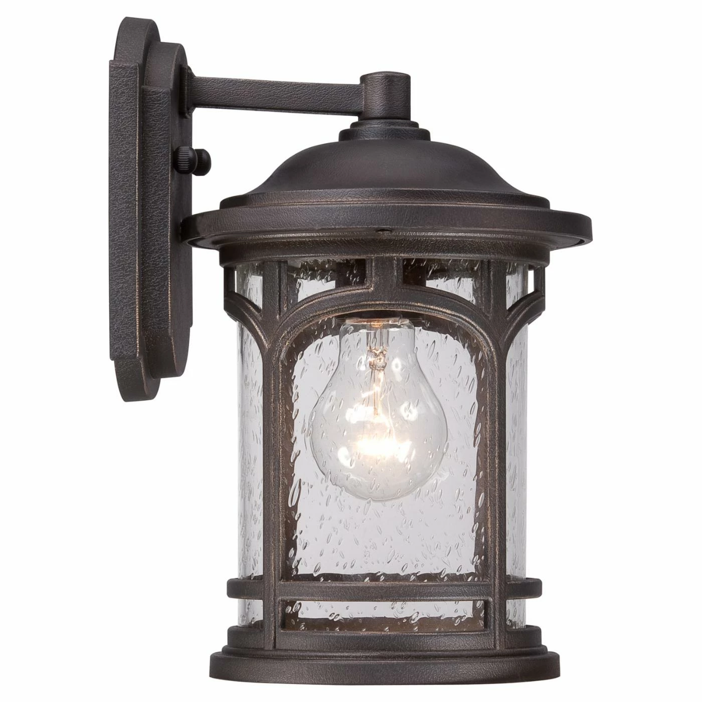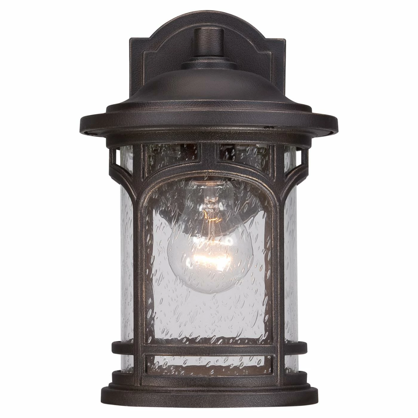 Stately arches and a handsome Palladian bronze finish make the Quoizel Marblehead MBH8407PN Outdoor Wall Lantern a distinctive way to light your front porch. This outdoor lantern features a seedy glass cylinder shade and comes in lamping options. Your choice dictates whether a bulb is included or not.