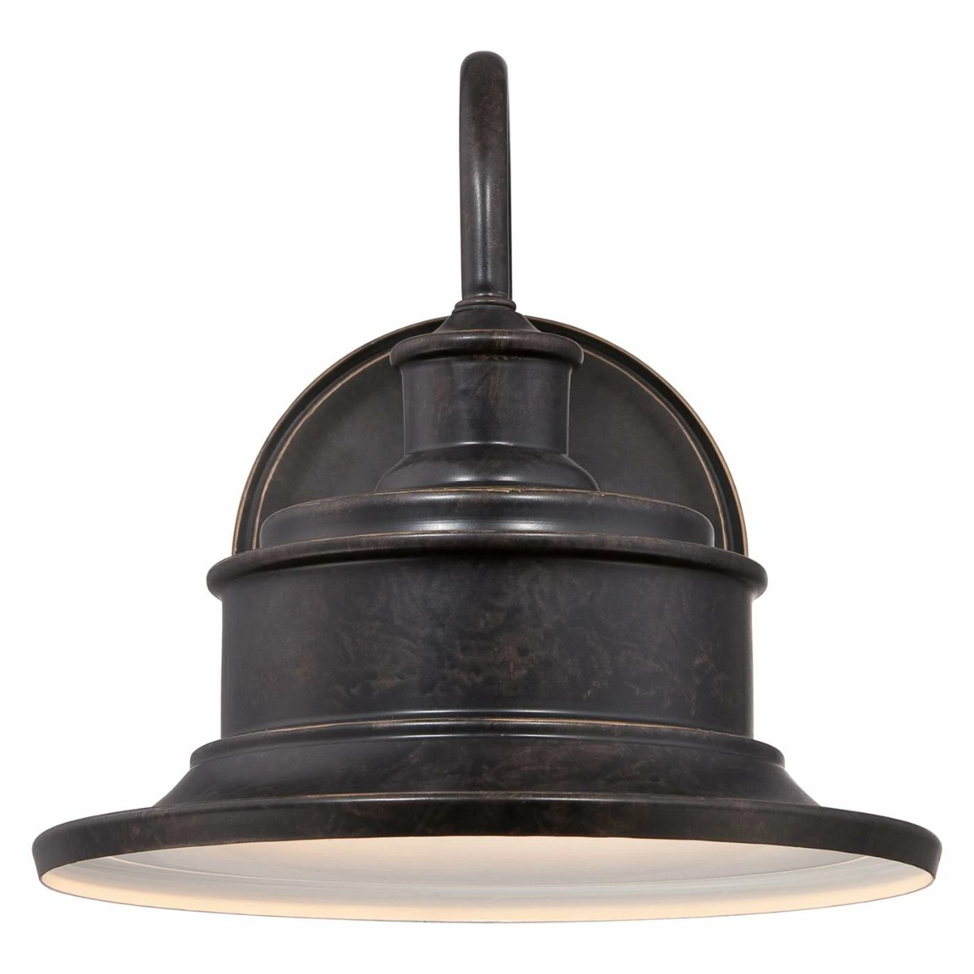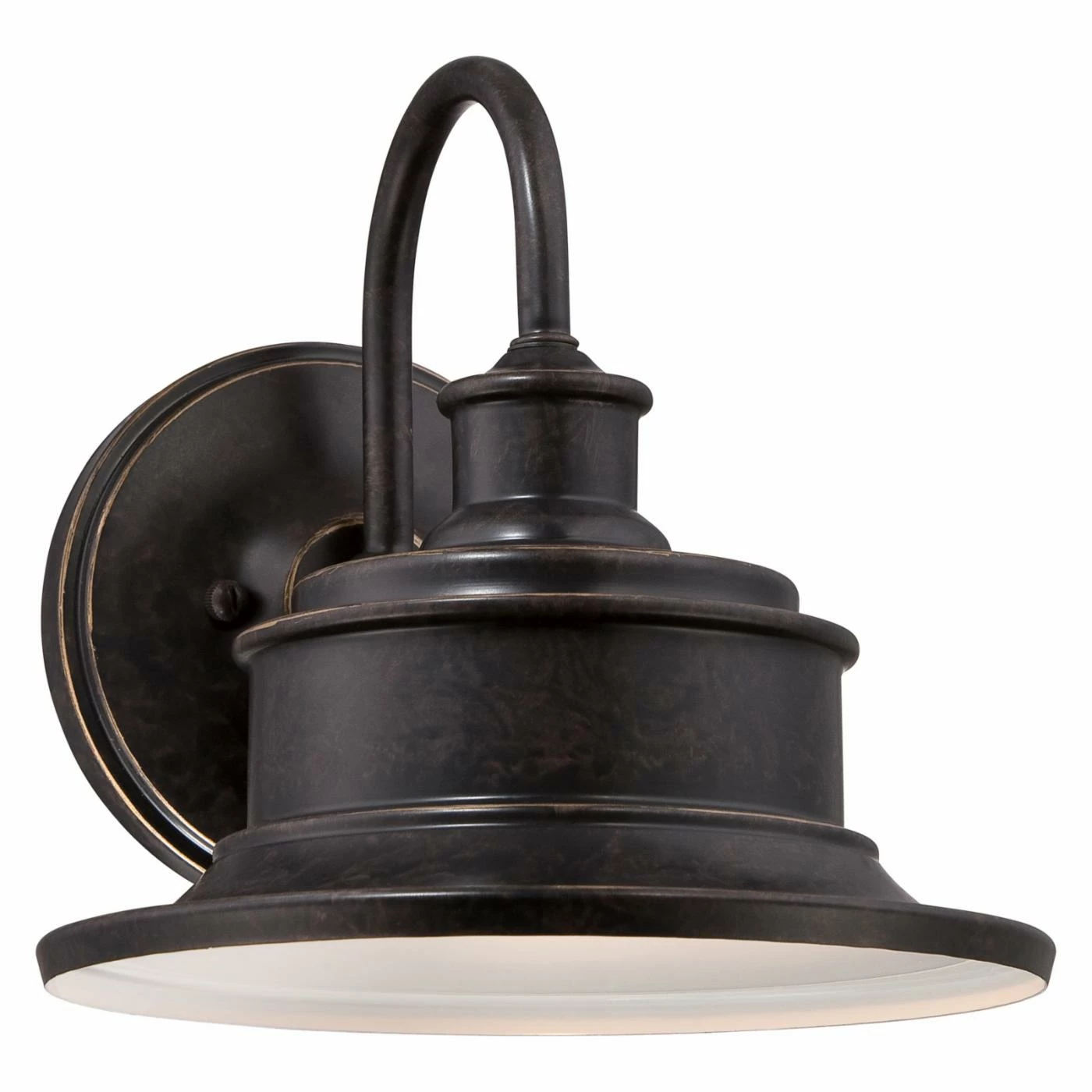 The broad metal shade on this Quoizel Seaford SFD8411 Outdoor Wall Lantern focuses light brilliantly. This outdoor wall lantern has simple, industrial style and comes in select finish options. It’s available in lamping options and your choice dictates whether a bulb is included or not.
