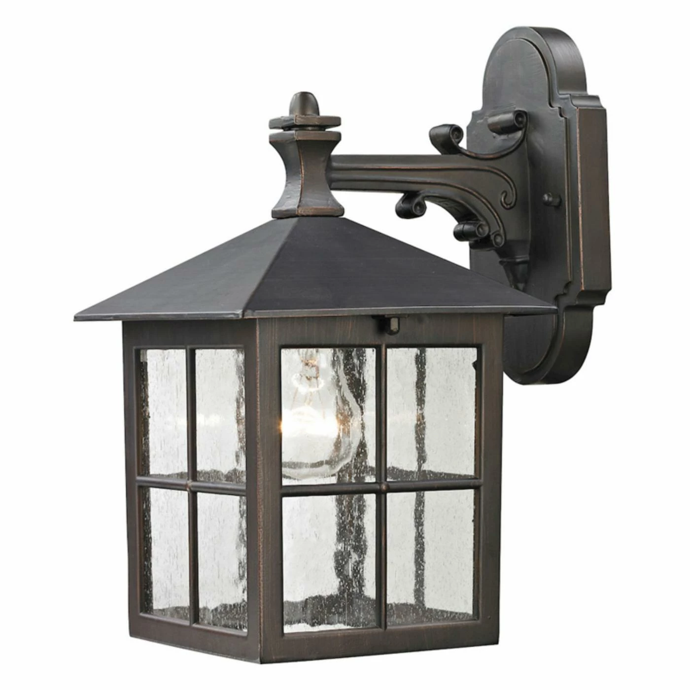 Complement the Mission-style design of your home with the Thomas Lighting Shaker Heights 8201 Outdoor Wall Sconce. The downlight is surrounded by clear seeded glass that complements the hazelnut bronze finish. Each side of the square frame features a windowpane style panel.