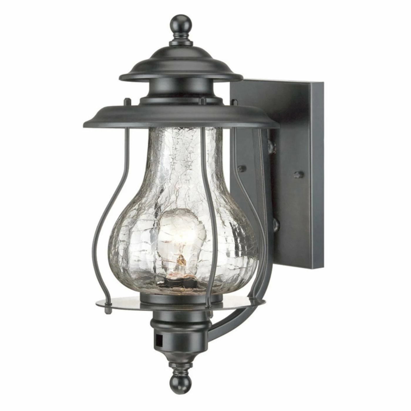 The mountain lodge look of the Acclaim Lighting Blue Ridge Outdoor Wall Mount Light Fixture is enhanced by a shapely, clear crackled shade and your choice of finish. This outdoor wall-mounted light fixture requires one 100-watt bulb (not included).