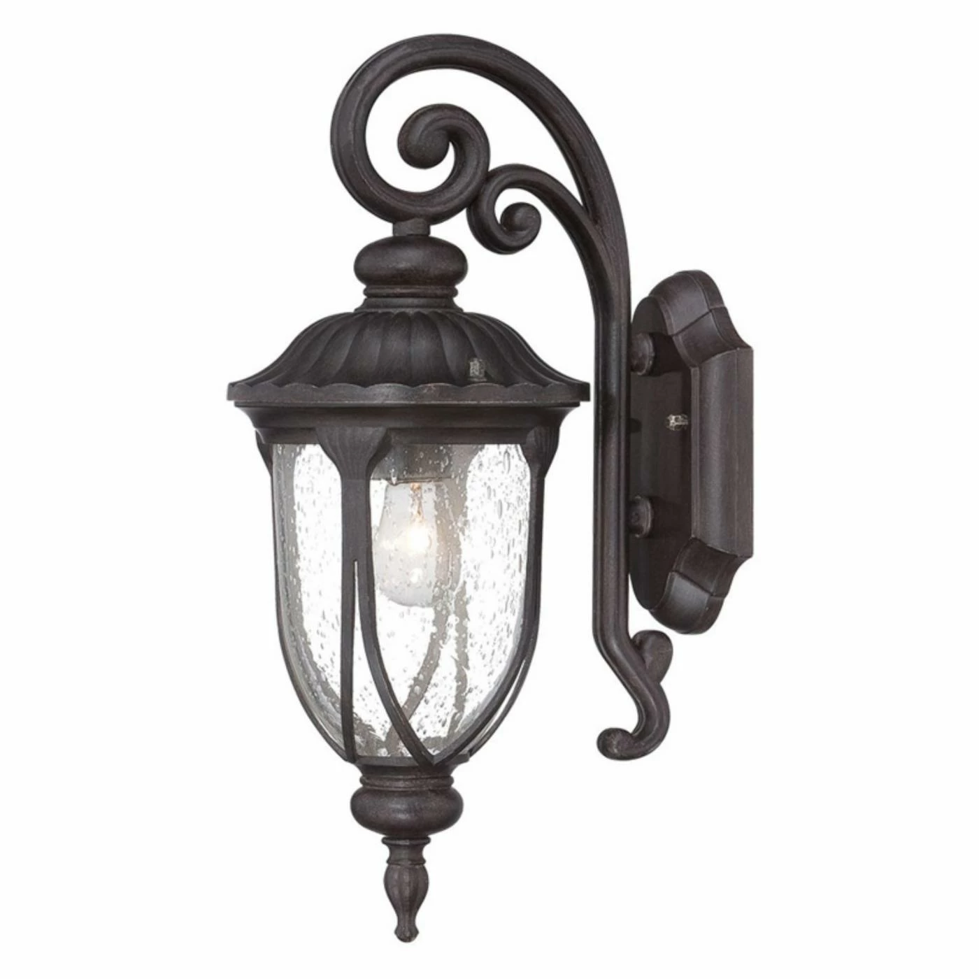 Attached to a dramatically curved arm, the Acclaim Lighting Laurens 6.75 in. Outdoor Wall Mount Light Fixture will give your home some updated curb appeal. This wall-mounted outdoor light comes in your chosen finish and features a clear seeded glass shade that houses a single bulb.