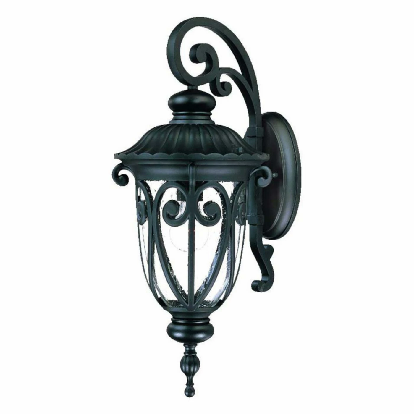 The Acclaim Lighting Naples 1 Light Outdoor Wall Mount Light Fixture is attached to an arched arm with scrollwork detailing that brings it a graceful, timeless look. Made of metal, this outdoor light fixture is available in your preferred finish and features a clear seeded-glass shade for added visual appeal.