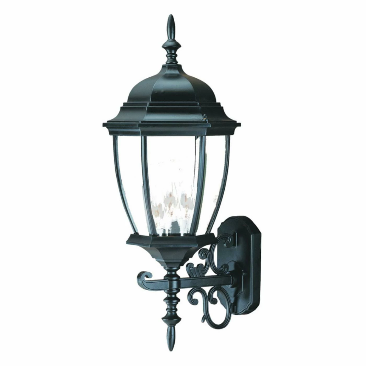 The Acclaim Lighting Wexford 9.25 in. 3 Light Outdoor Wall Mount Light Fixture creates a stylish lighting accent with its decorative arm mount and chic lantern shape. This rugged light fixture is available in your chosen finish to get the perfect match, and clear beveled glass allows the light from three candelabra bulbs to brightly shine through.