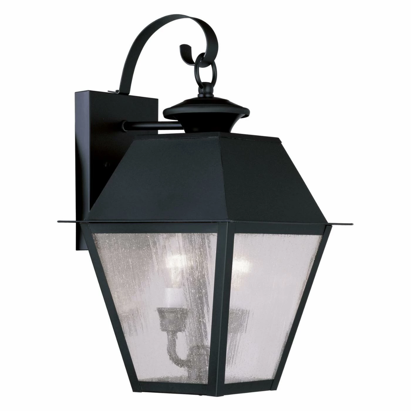 With a traditional style that also looks beautiful on contemporary homes, the Livex Mansfield 2165-04 2-Light Outdoor Wall Lantern in Black presents an elegant lighting solution to your doorstep or patio. This metal outdoor wall lantern is finished in sleek black, with a seeded glass shade.
