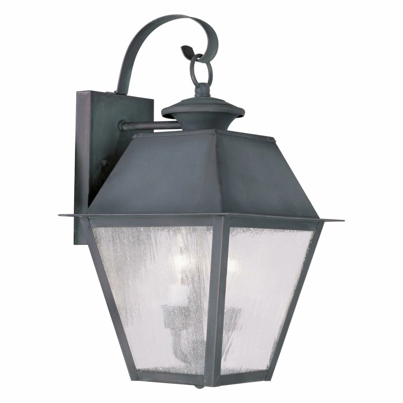 The Livex Mansfield 2165-61 2-Light Outdoor Wall Lantern in Charcoal is a beautiful and durable lighting choice for any home. Made from durable metal, this fixture has a charcoal finish that lends an antiqued look, and a seeded glass shade for gently diffused light.
