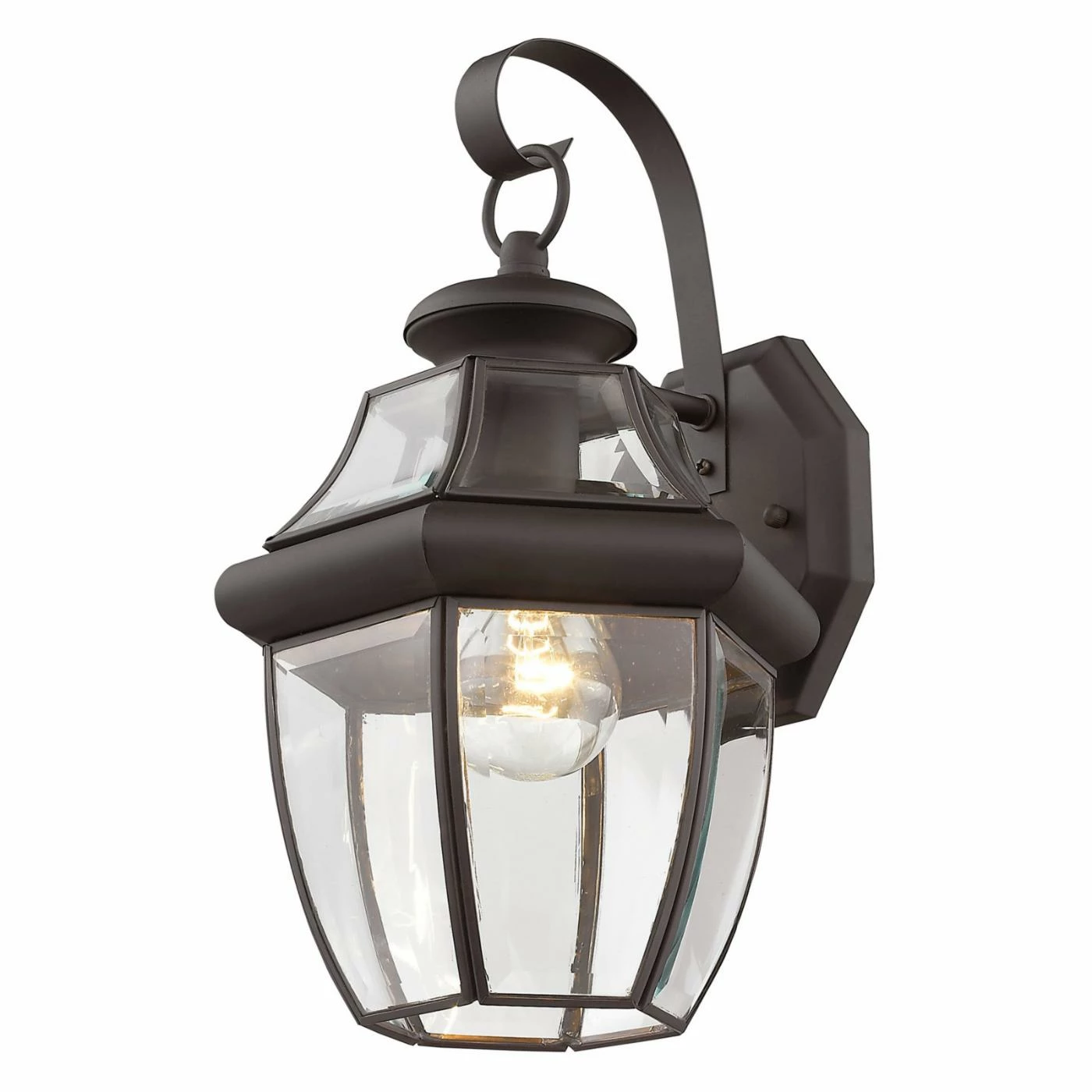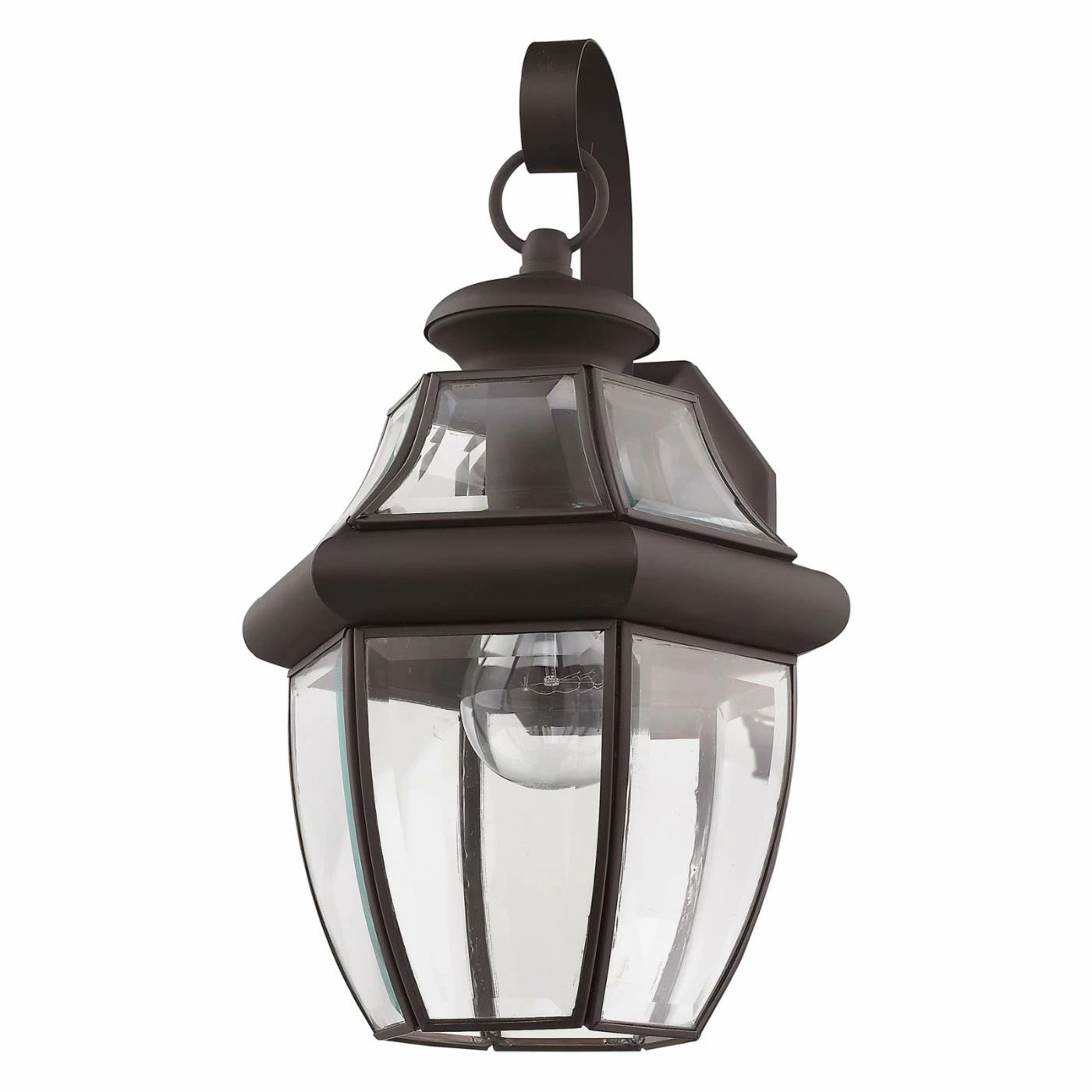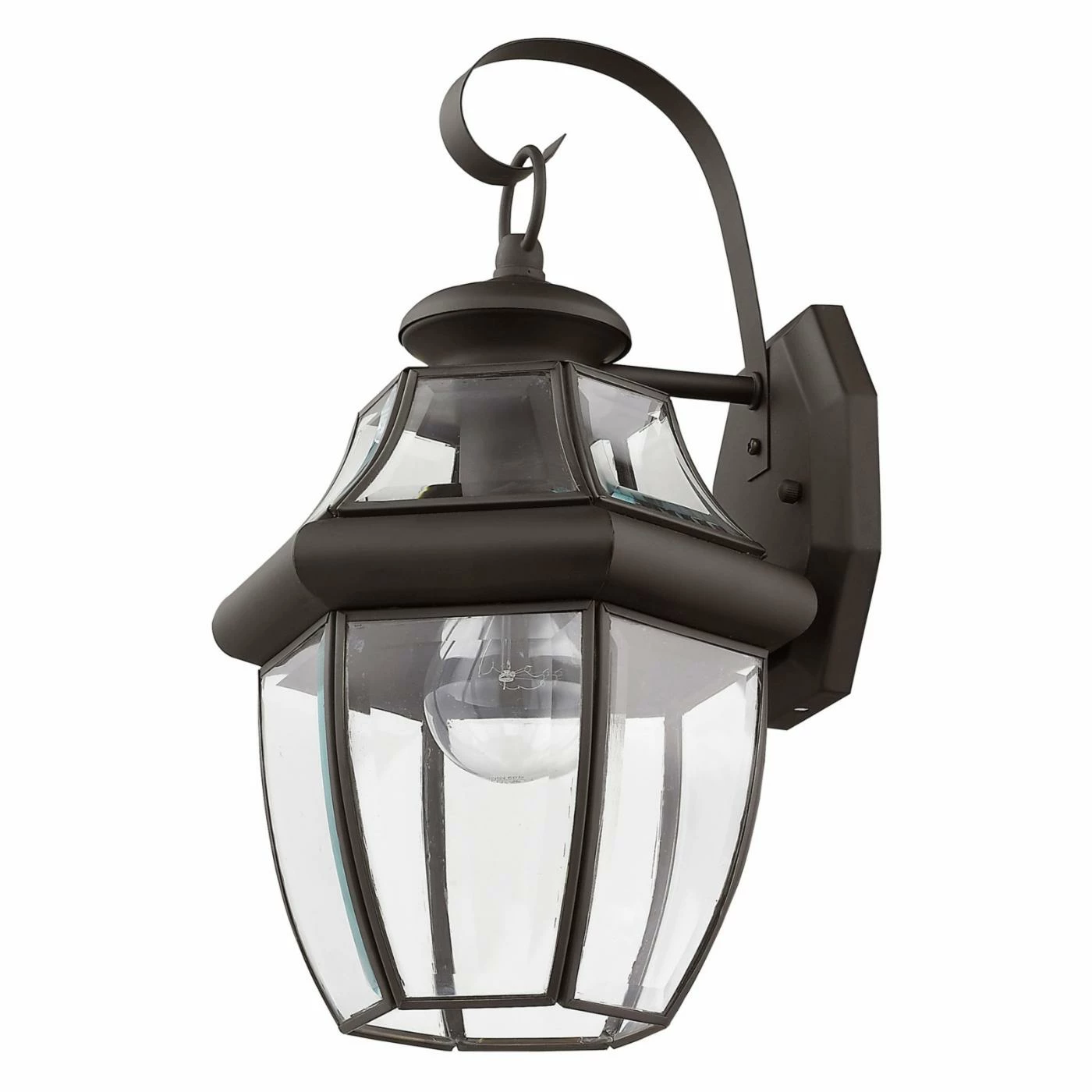 The Livex Monterey Outdoor Wall Lantern is perfect against a brick or stone facade. Designed to resemble a hanging lantern, this light features a bronze finish and clear beveled glass. It uses one 100-watt medium-base bulb (not included) and measures 8.5W x 13H inches with an 8.25-inch wall extension.