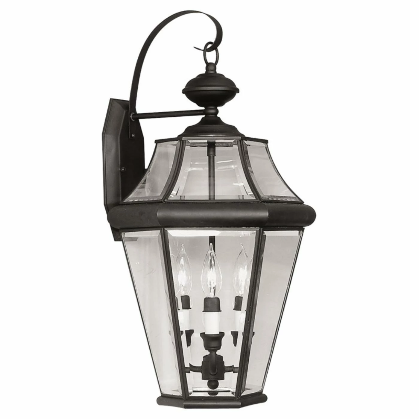 The Livex Georgetown Outdoor Wall Lantern is scaled to fit into a grand two-story entry. Reminiscent of a hanging lantern, this light features a black finish and clear beveled glass. It uses three 60-watt candelabra-base bulbs (not included) and measures 13W x 24H inches with a 12-inch wall extension.