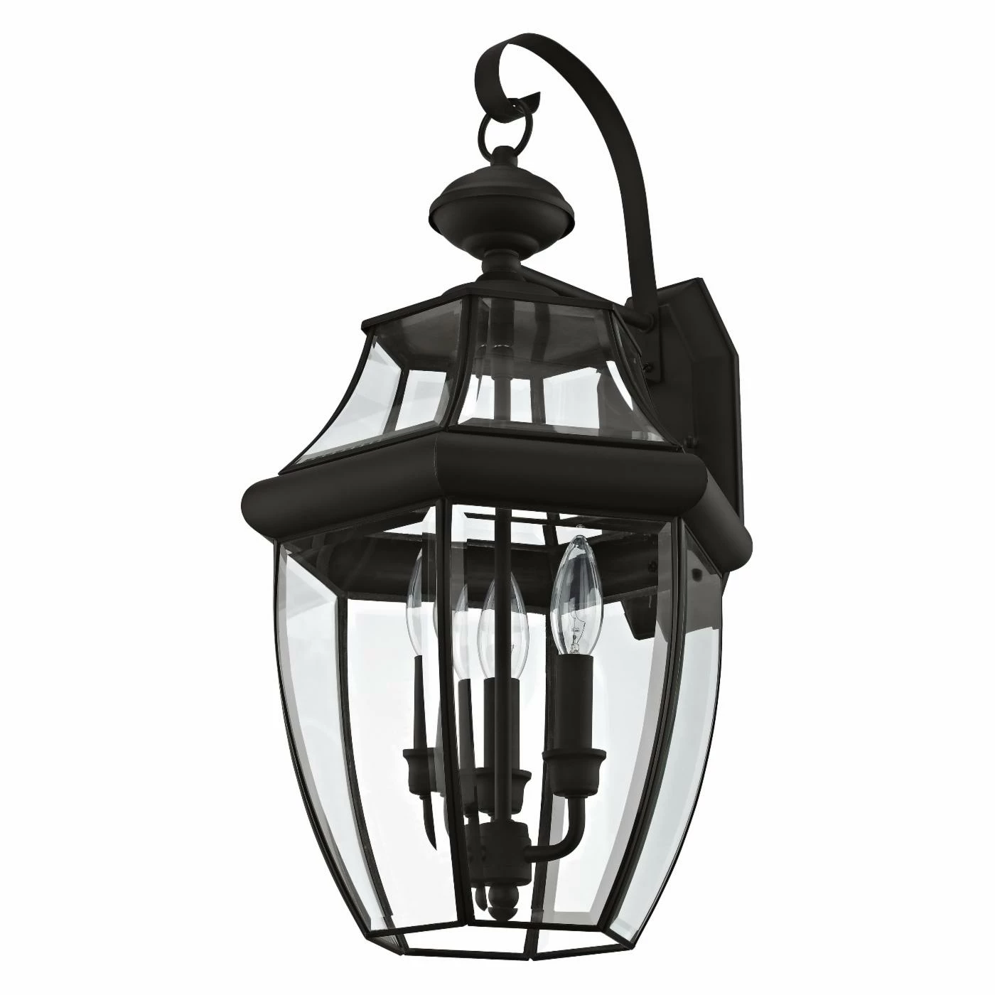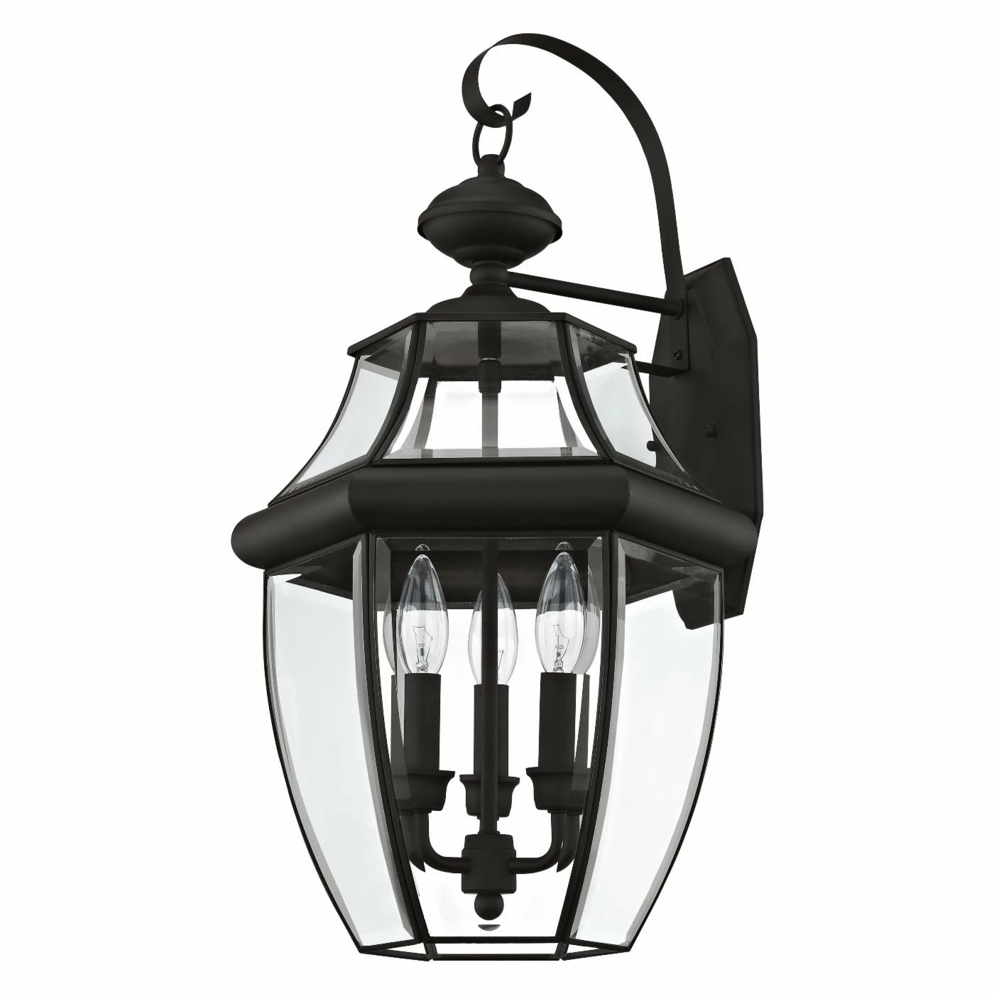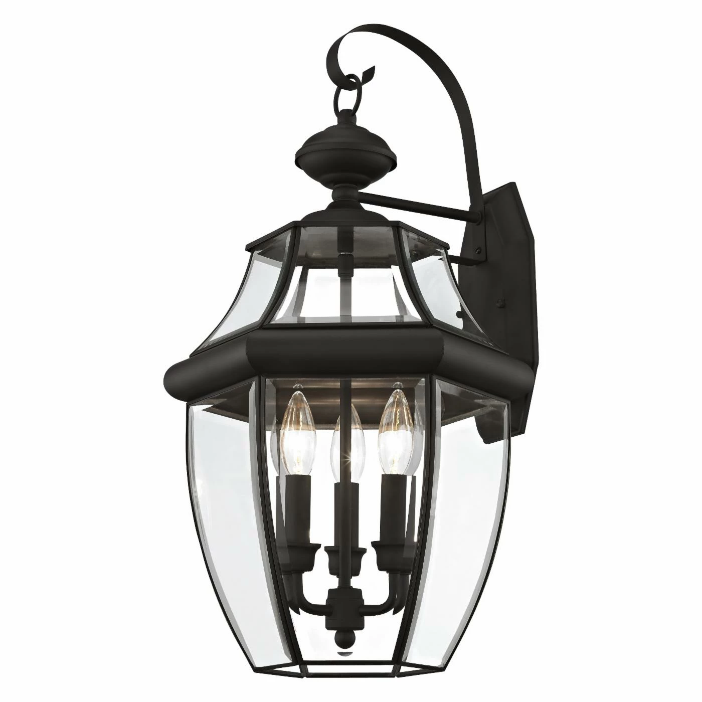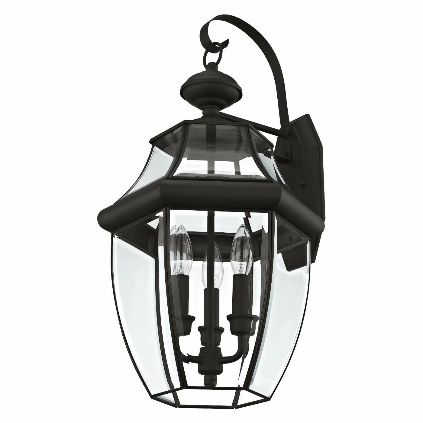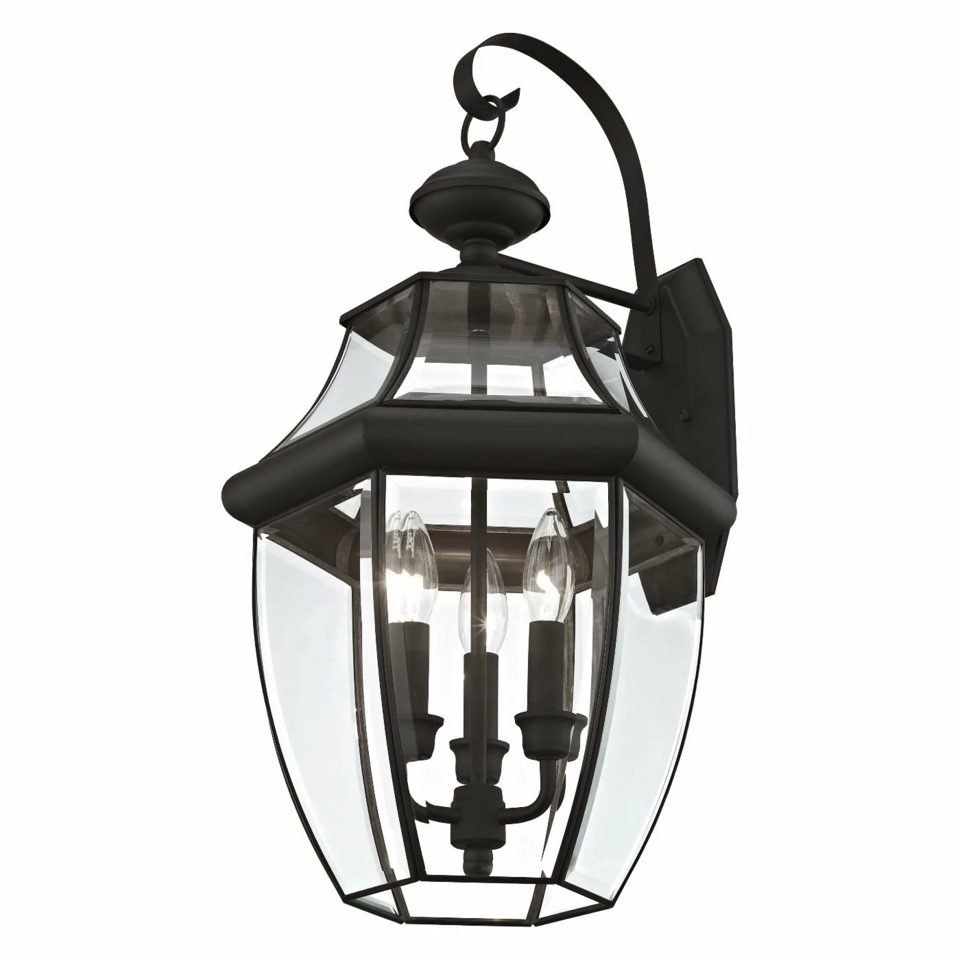 Imagine the Livex Monterey Outdoor Wall Lantern in the main entry of your home. Designed to resemble a hanging lantern, this light features a black finish and clear beveled glass. It uses three 60-watt candelabra-base bulbs (not included) and measures 12.5W x 22.5H inches with an 11.75-inch wall extension.