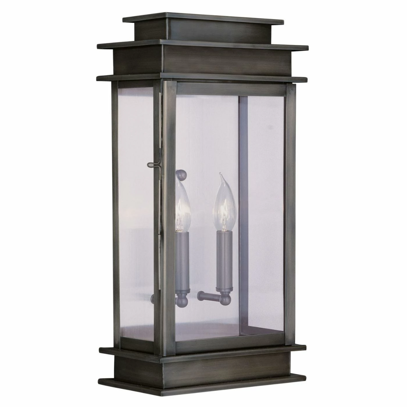 Traditional design enthusiasts will adore this Livex Princeton 2018-29 Outdoor Wall Lantern, with its brass craftsmanship, pewter finish, and clear glass panels. It requires two 60-watt bulbs, not included.