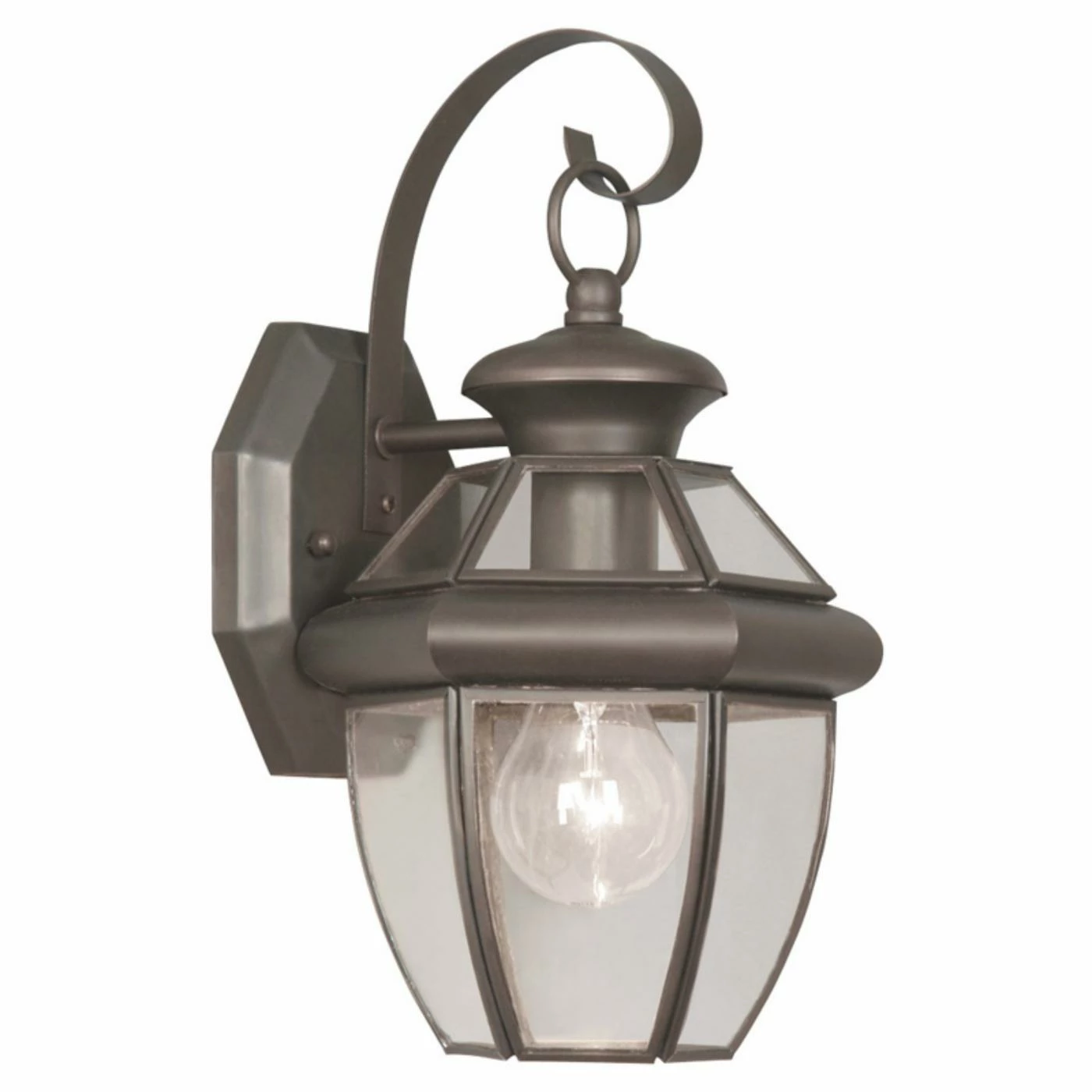 The Livex Monterey Outdoor Wall Lantern is the right height for placement between your garage doors. Designed to resemble a hanging lantern, this light features a bronze finish and clear flat glass. It uses one 100-watt medium-base bulb (not included) and measures 7W x 12.5H inches with a 7.5-inch wall extension.