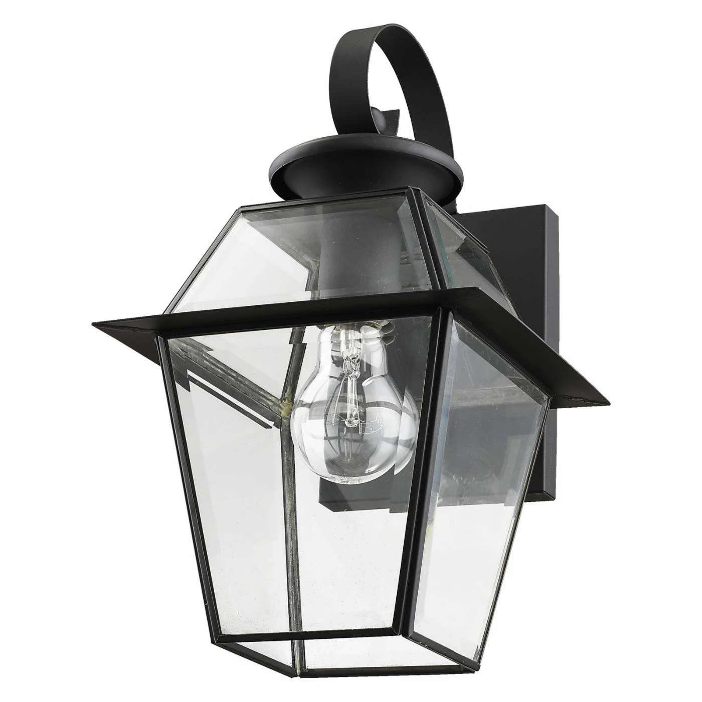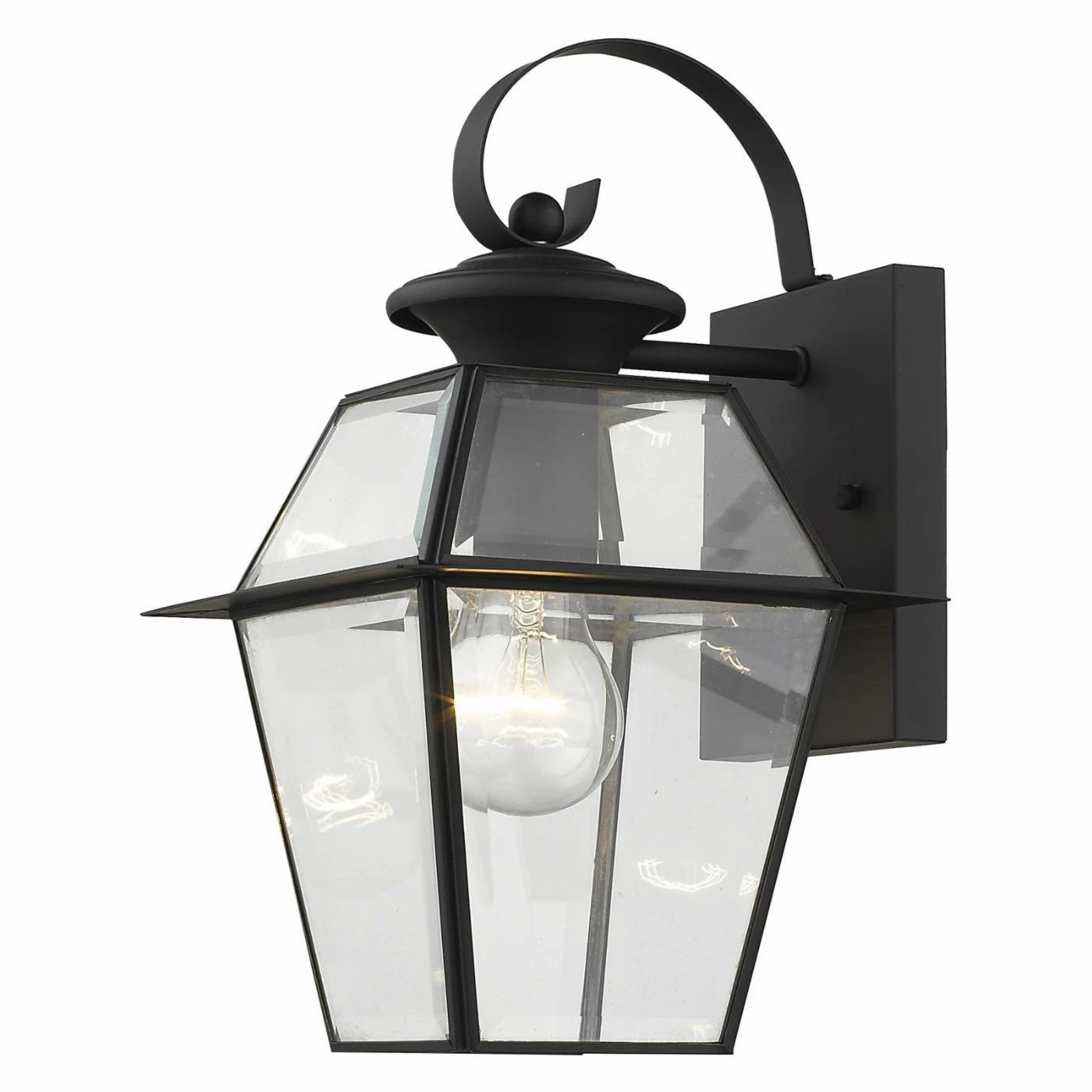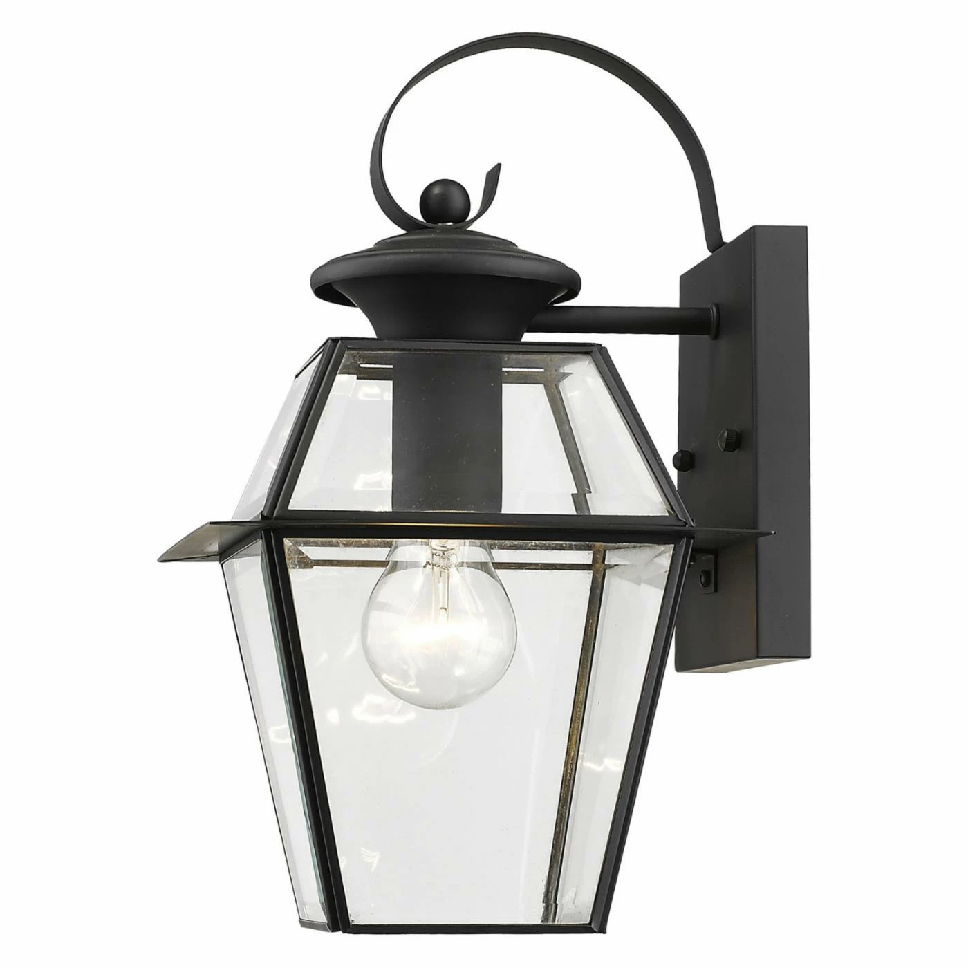 The Livex Westover Wall Lantern creates elegant illumination for a variety of outdoor settings. It features a smooth black finish and a clear, beveled glass panel enclosure at the end of a curved hanging arm for a classic, lantern-style look. Use for any porch, patio, garage or entryway. Requires a single 100-watt medium base bulb (not included).