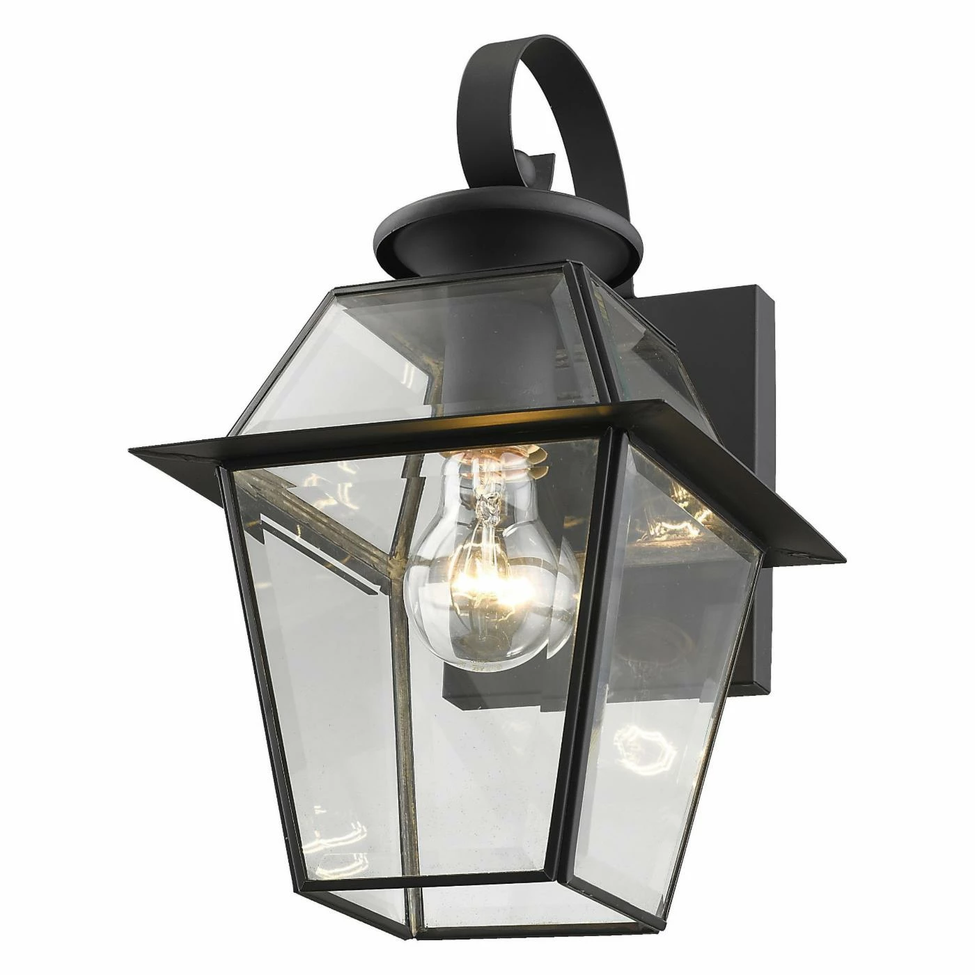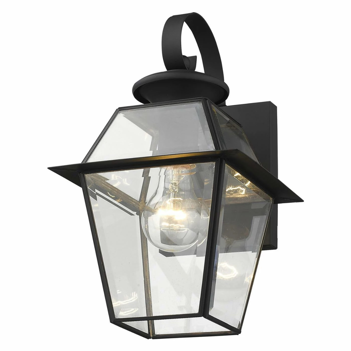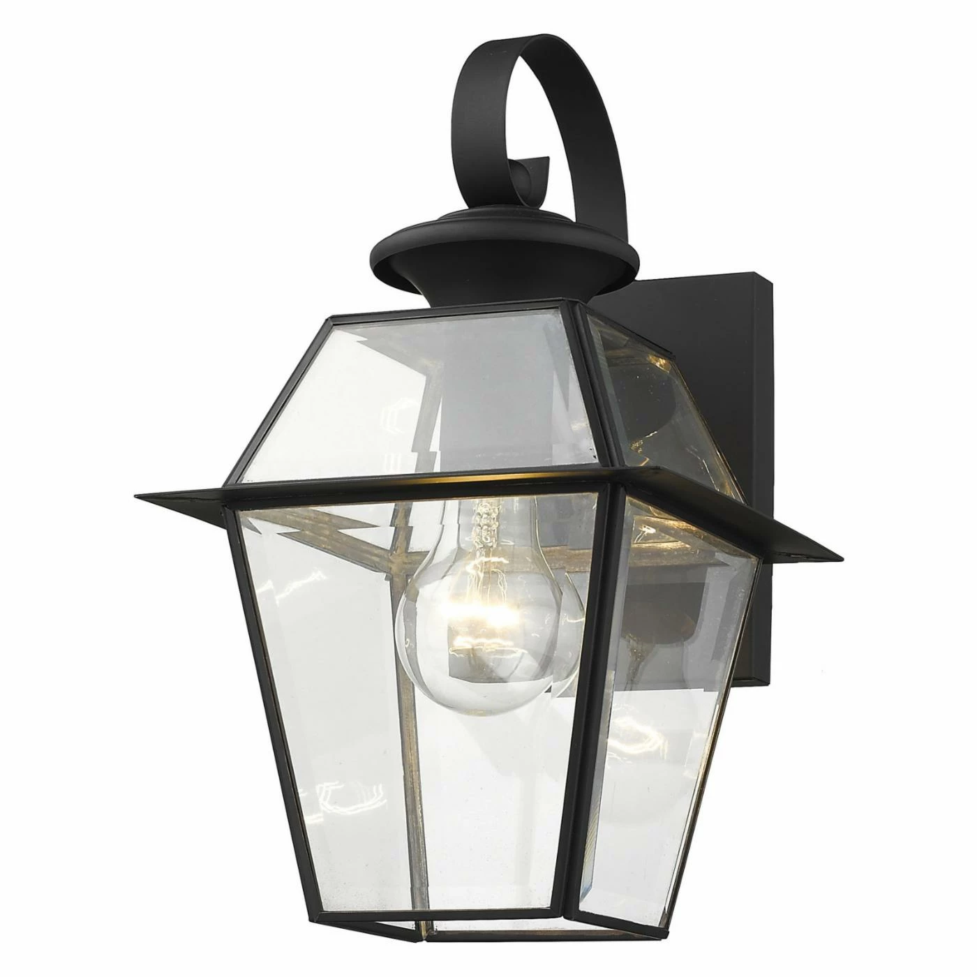 The Livex Westover Wall Lantern creates elegant illumination for a variety of outdoor settings. It features a smooth black finish and a clear, beveled glass panel enclosure at the end of a curved hanging arm for a classic, lantern-style look. Use for any porch, patio, garage or entryway. Requires a single 100-watt medium base bulb (not included).