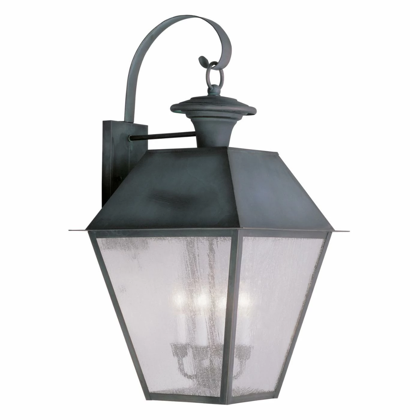 The Livex Mansfield 2172-61 4-Light Outdoor Wall Lantern in Charcoal puts a modern twist on a traditional design, making it a timeless addition to any home. Featuring a beautiful charcoal finish that gives it an antiqued appearance, this outdoor wall lantern has a durable metal construction and seeded glass shade.