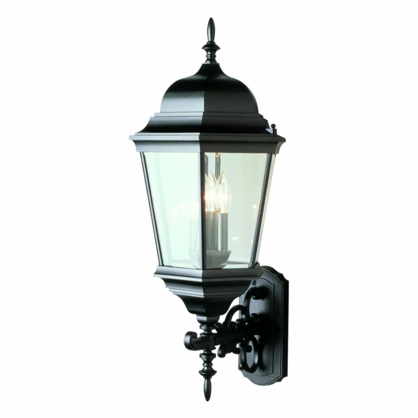 Classic forms and clean lines make the Transglobe 51000 BK Coach Lantern – Black – 13W in. a fresh approach to traditional style. The metal body of this wall-mounted fixture has a deep black finish and six panels of clear, beveled glass that surround a trio of 60-watt medium base candelabra bulbs.